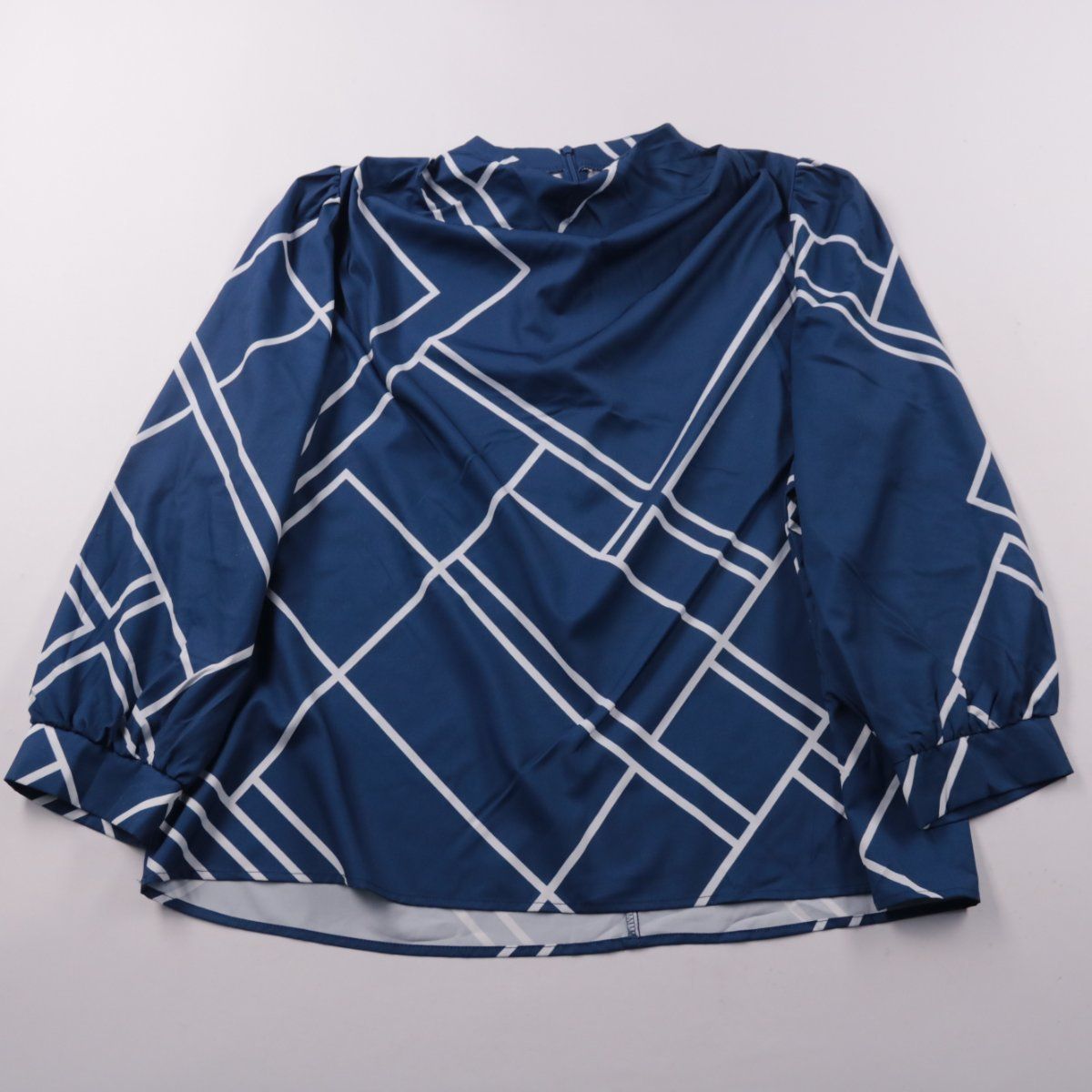 Женская блузка Shein Curve из гладкого полиэстера, тёмно-синяя с белым геометрическим принтом. Длинный рукав и застёжка-молния сзади делают модель удобной для офиса и повседневных образов. Материал практичный и неприхотлив в уходе, быстро сохнет.