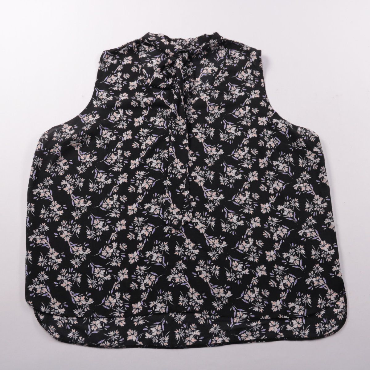 Женская блузка Atmosphere без рукавов, чёрная с мелким цветочным принтом и завязкой-бант на воротнике. Подойдёт для офиса и повседневных образов, легко сочетается с брюками и юбками. Ткань из полиэстера практически не мнётся и быстро сохнет.