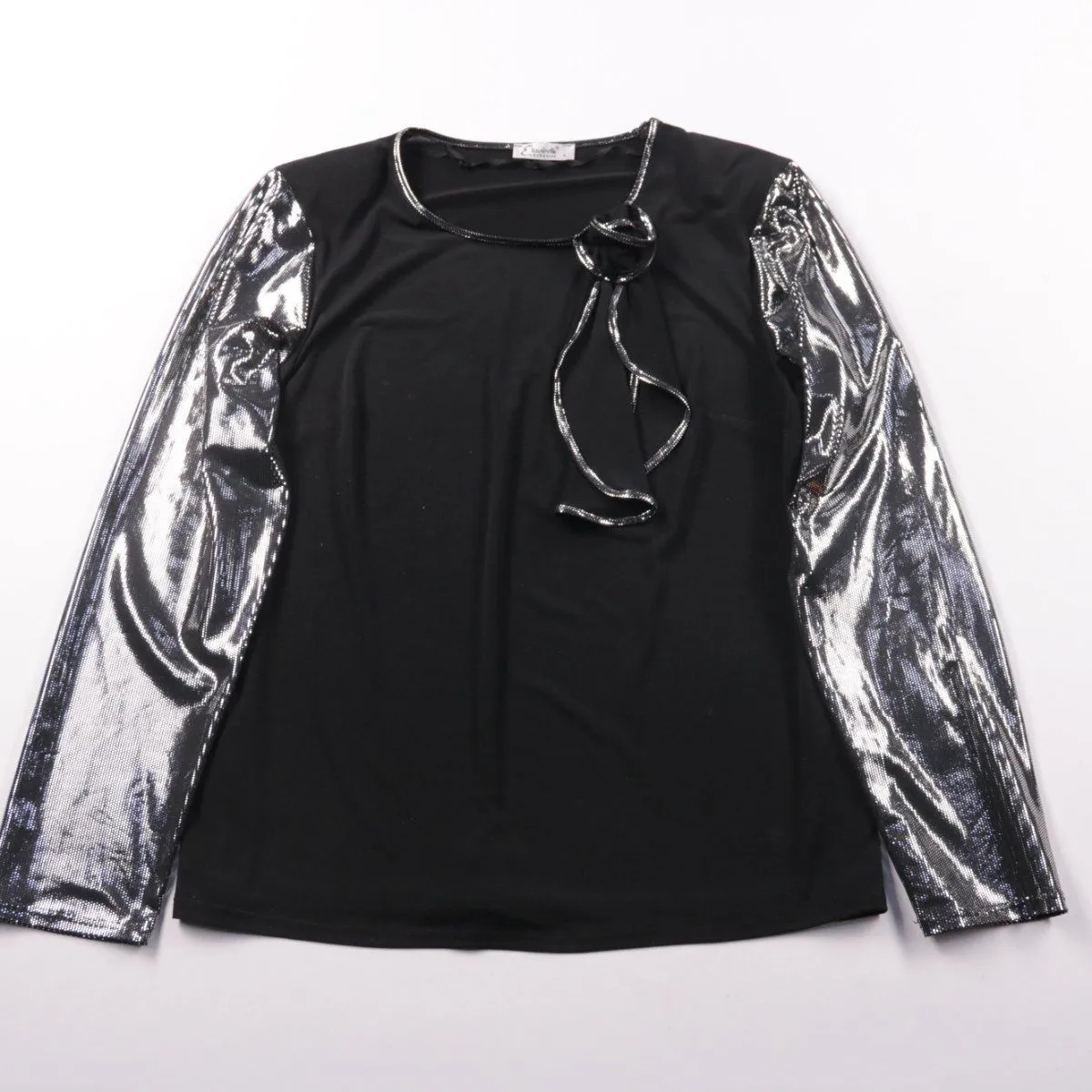 Блузка Elizabeth Exclusive чёрного цвета с длинными серебристыми рукавами с эффектом металлик и декоративной завязкой у горловины. Подойдёт для вечеринок и выходов, легко сочетать с юбкой или брюками. Материал практичный и почти не мнётся.