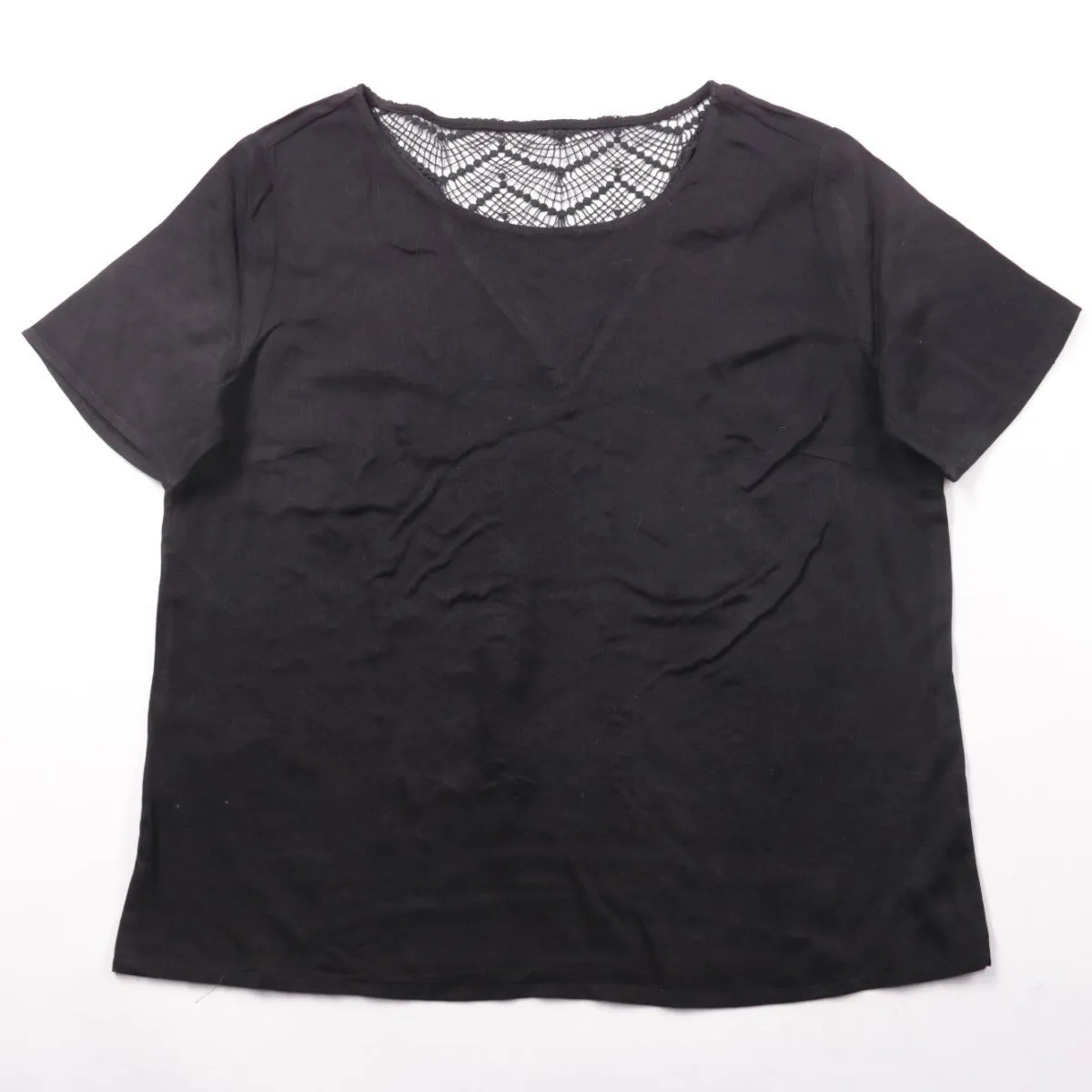 Женская чёрная блузка с коротким рукавом и кружевной вставкой у горловины/на спинке. Подойдёт для повседневных образов и офиса, хорошо сочетается с юбкой или брюками. Практичное преимущество — лёгкая ткань и комфортная посадка без лишнего объёма.