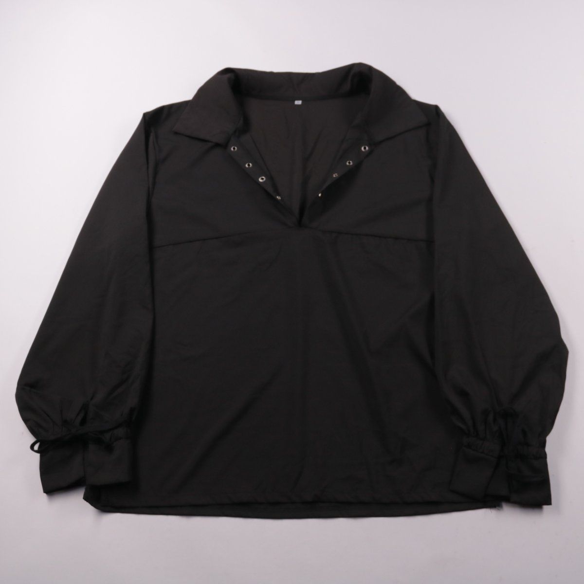 Женская чёрная блузка с отложным воротником и V‑вырезом на кнопках. Подойдёт для офиса и повседневных образов, легко сочетается с брюками и юбками. Длинные рукава на манжетах удобны для носки в прохладную погоду.