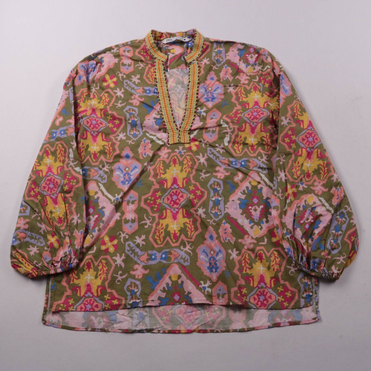 Блузка Zara с ярким этно-принтом и V-образным вырезом с декоративной тесьмой. Подойдёт для повседневных летних образов и отдыха. Лёгкая ткань комфортна в носке и не сковывает движения.