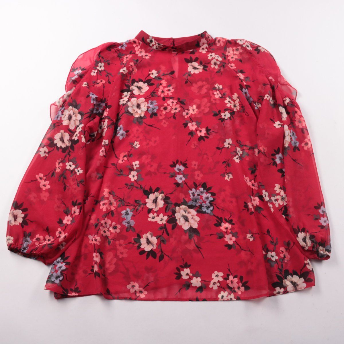 Женская блузка с цветочным принтом на красном фоне и высоким воротником-стойкой. Лёгкая полупрозрачная ткань и объёмные рукава подойдут для офиса или вечерних выходов. Практично сочетается с однотонными брюками и юбками, не утяжеляя образ.
