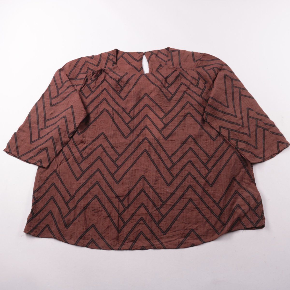 Женская блузка Only Carmakoma коричневого цвета с чёрным геометрическим принтом «зигзаг» и рукавом 3/4. Подойдёт для повседневных образов и офиса, хорошо сочетается с однотонными брюками или джинсами. Лёгкая вискозная ткань комфортна в носке и хорошо дышит.