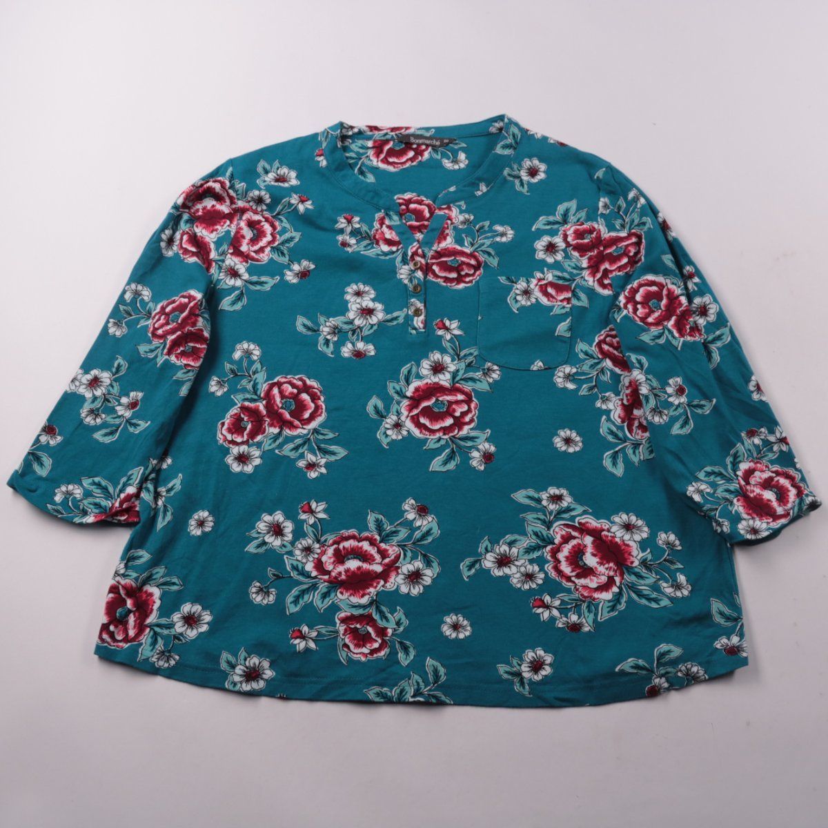 Блузка Bonmarché из хлопка с цветочным принтом и планкой на пуговицах у горловины. Подойдёт для повседневных образов и офиса в стиле casual, хорошо смотрится с джинсами и однотонными брюками. Хлопок дышит и комфортен в носке.