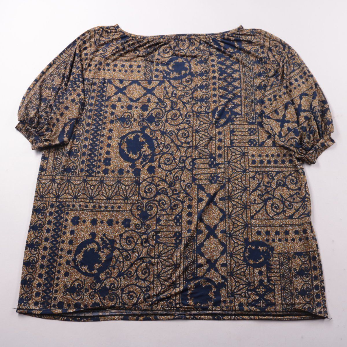 Блузка TU свободного кроя с короткими рукавами и ярким орнаментальным принтом. Подойдёт для повседневных образов и работы, хорошо сочетается с однотонными брюками или джинсами. Ткань с добавлением эластана слегка тянется и проста в уходе.