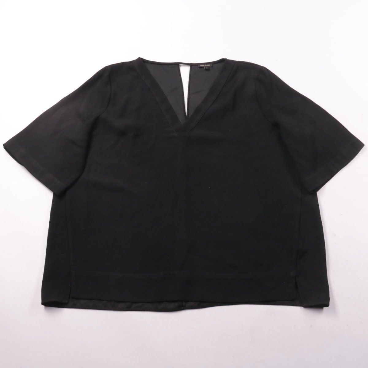 Чёрная блузка River Island с V-образным вырезом и коротким рукавом. Подойдёт для офиса и повседневных образов, легко сочетается с брюками и юбками. Практичный плюс — материал из полиэстера, который проще в уходе и меньше мнётся.