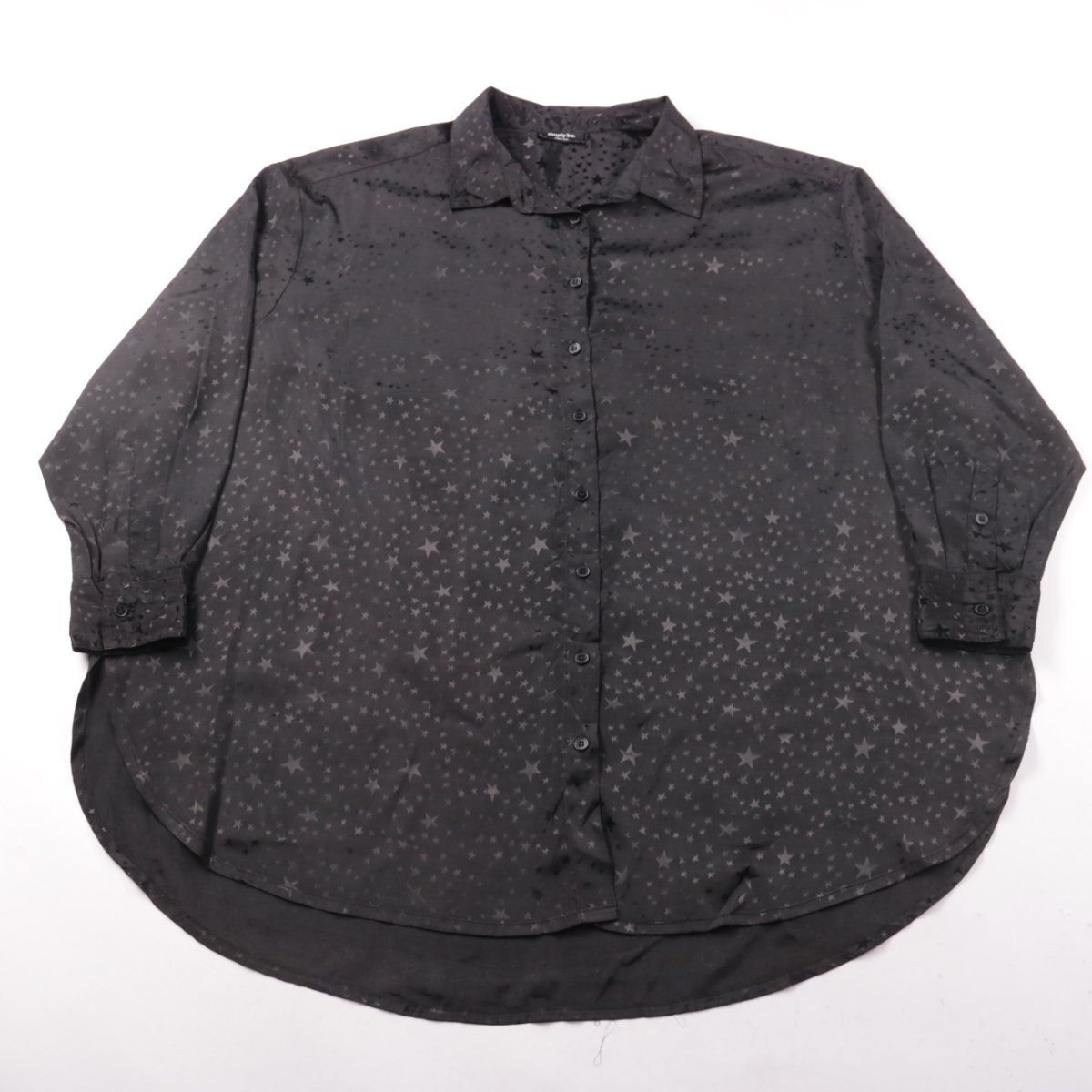 Женская рубашка simply be. чёрного цвета с принтом в звёзды и длинным рукавом на манжетах. Подойдёт для повседневных образов и как лёгкий верхний слой в офисе или на прогулке. Удлинённый закруглённый низ удобно носить навыпуск.