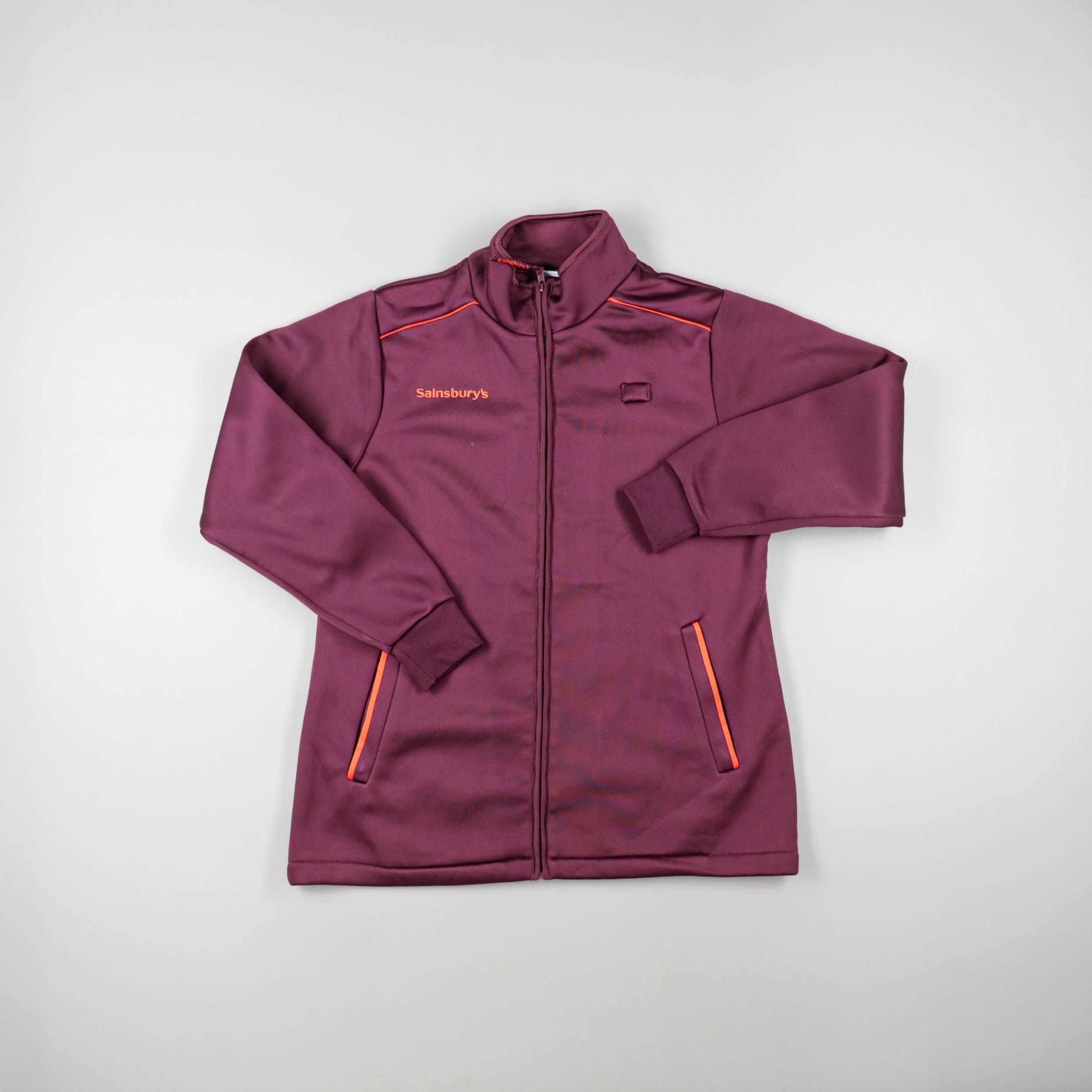 Олимпийка на молнии Sainsbury's в бордовом цвете с контрастной оранжевой отделкой и воротником-стойкой. Подойдёт для повседневной носки и лёгких тренировок в прохладную погоду. Практичный плюс — два боковых кармана и застёжка-молния по всей длине.