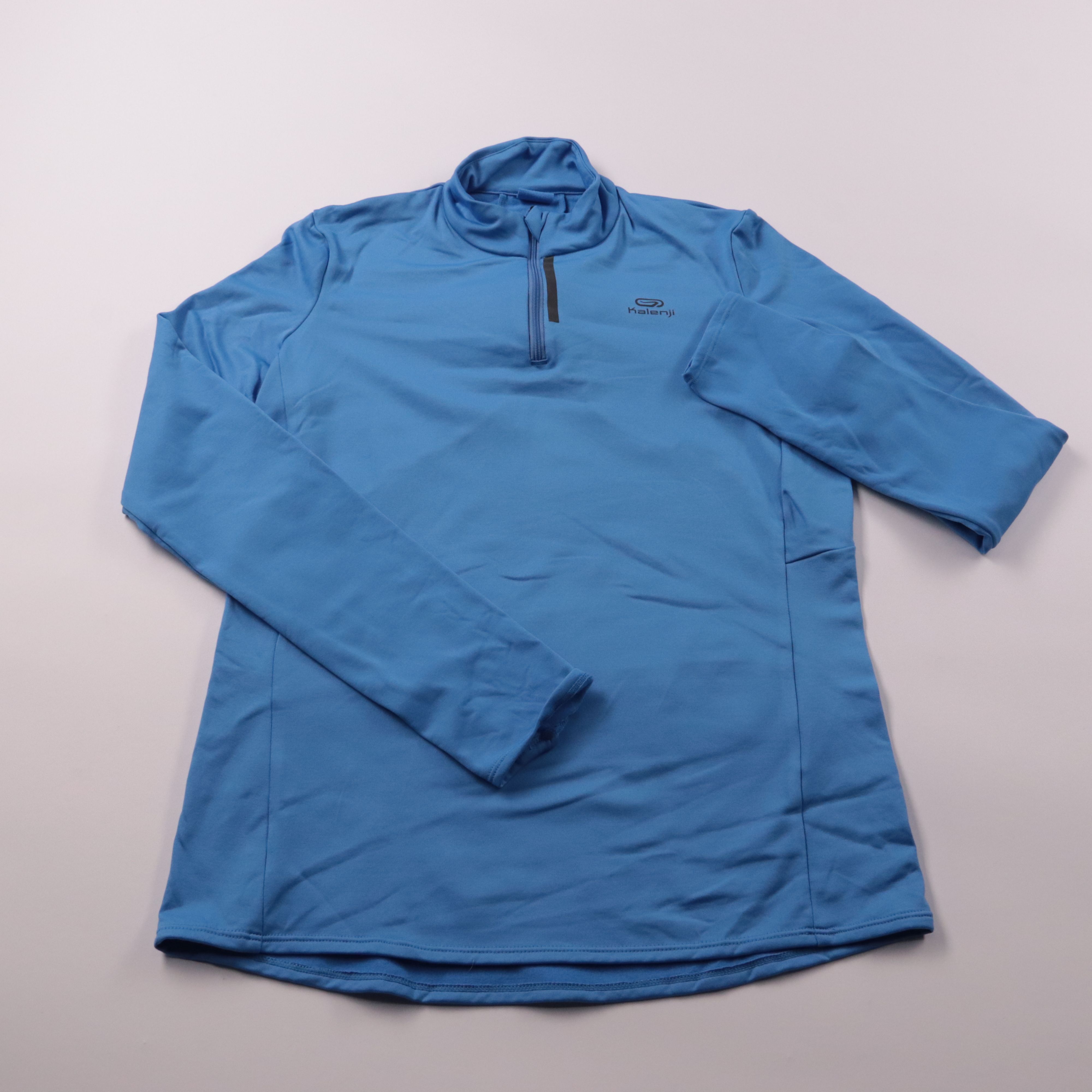 Спортивная толстовка Kalenji голубого цвета с воротником-стойкой и короткой молнией. Подойдёт для бега, тренировок и активных прогулок в прохладную погоду, удобно носить как второй слой. Лёгкий синтетический материал быстро сохнет и не сковывает движения.