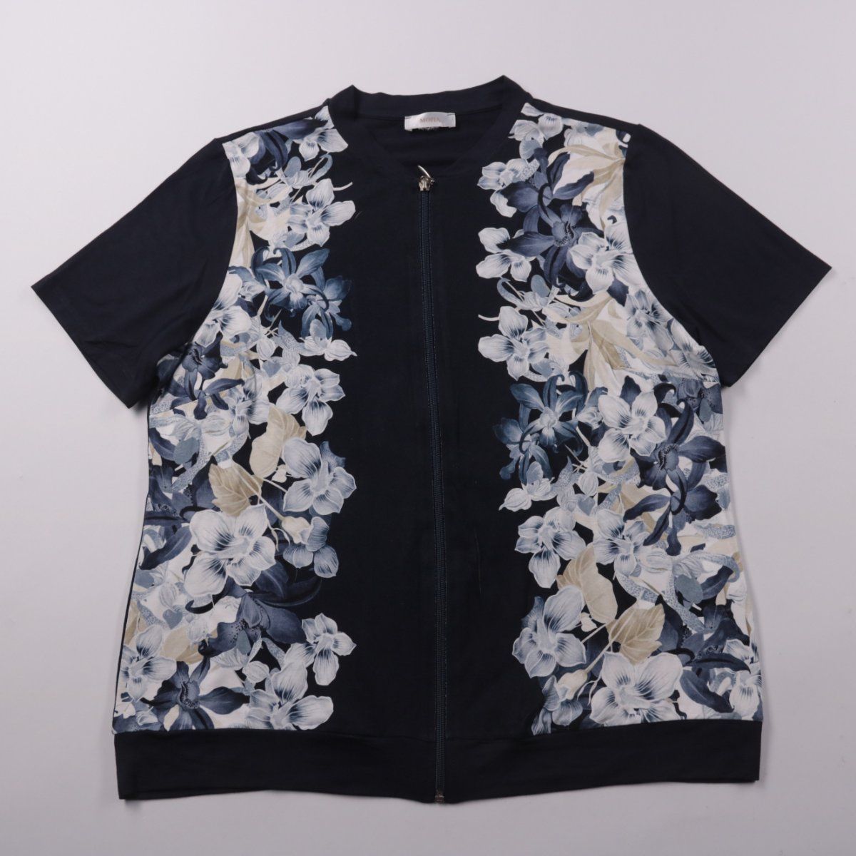 Кофта Mona на молнии с коротким рукавом и цветочным принтом по полочкам. Подойдёт для повседневных образов и офиса в тёплое время или как лёгкий верхний слой. Практичный плюс — эластичная ткань хорошо тянется и комфортно садится по фигуре.
