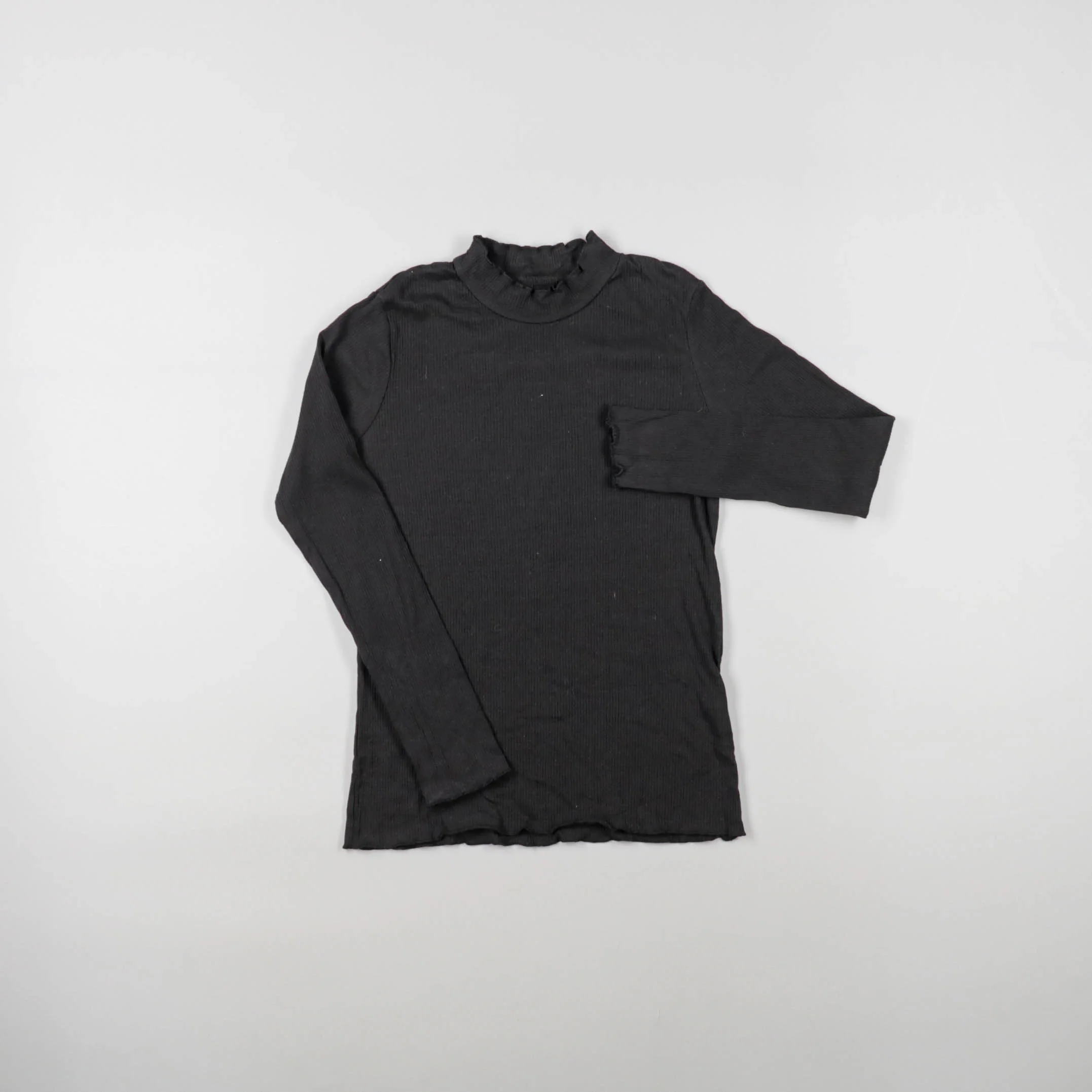 Чёрный женский лонгслив в рубчик с высоким воротником-стойкой и слегка волнистыми краями. Подойдёт для повседневных образов и как базовый слой под жакет или кардиган. Трикотаж тянется и комфортно садится по фигуре, не сковывая движения.