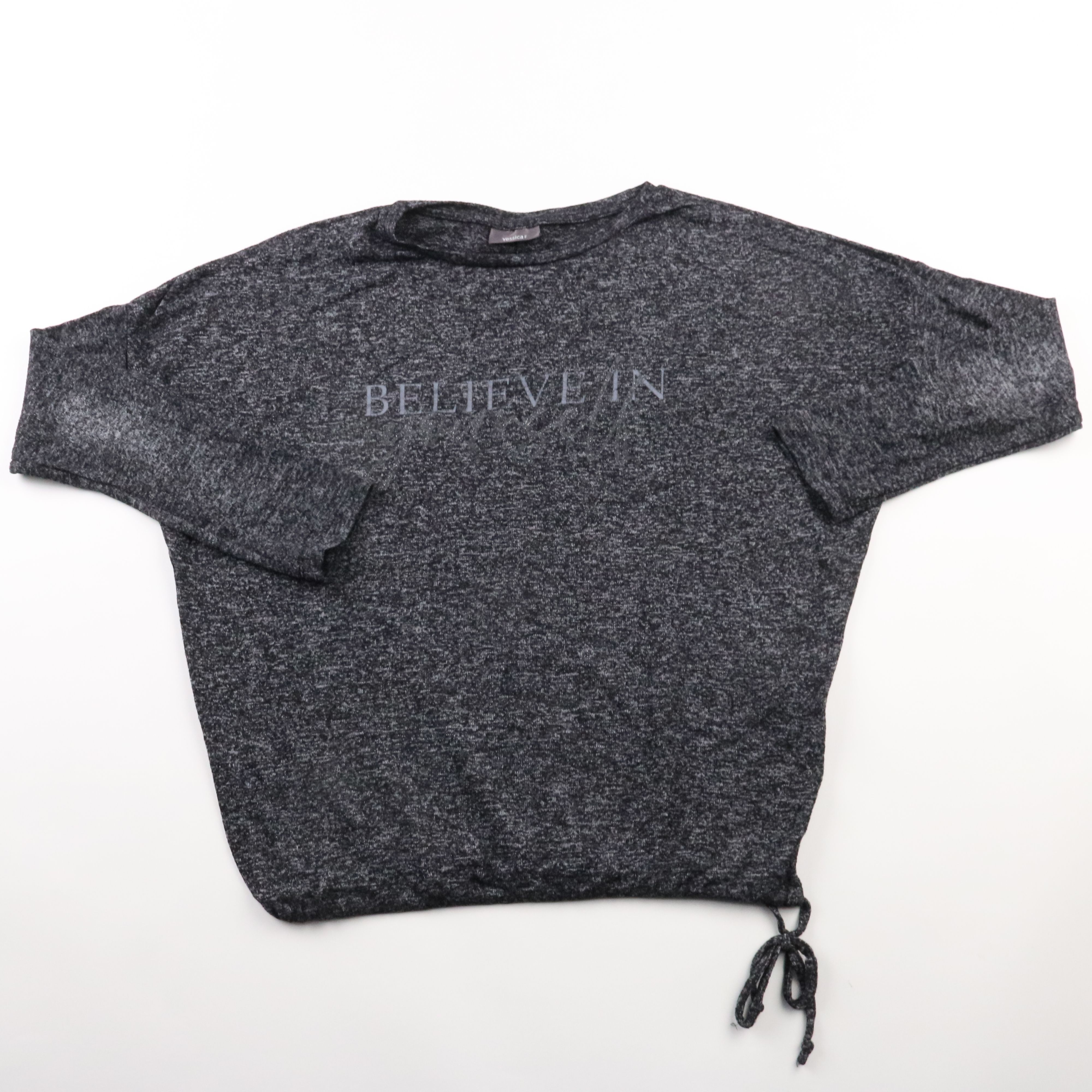 Женский лонгслив Yessica из меланжевого трикотажа с надписью спереди и кулиской по низу. Подойдёт для повседневных образов в прохладную погоду, хорошо смотрится с джинсами и леггинсами. Ткань мягкая и слегка тянется, поэтому удобно сидит и не стесняет ...