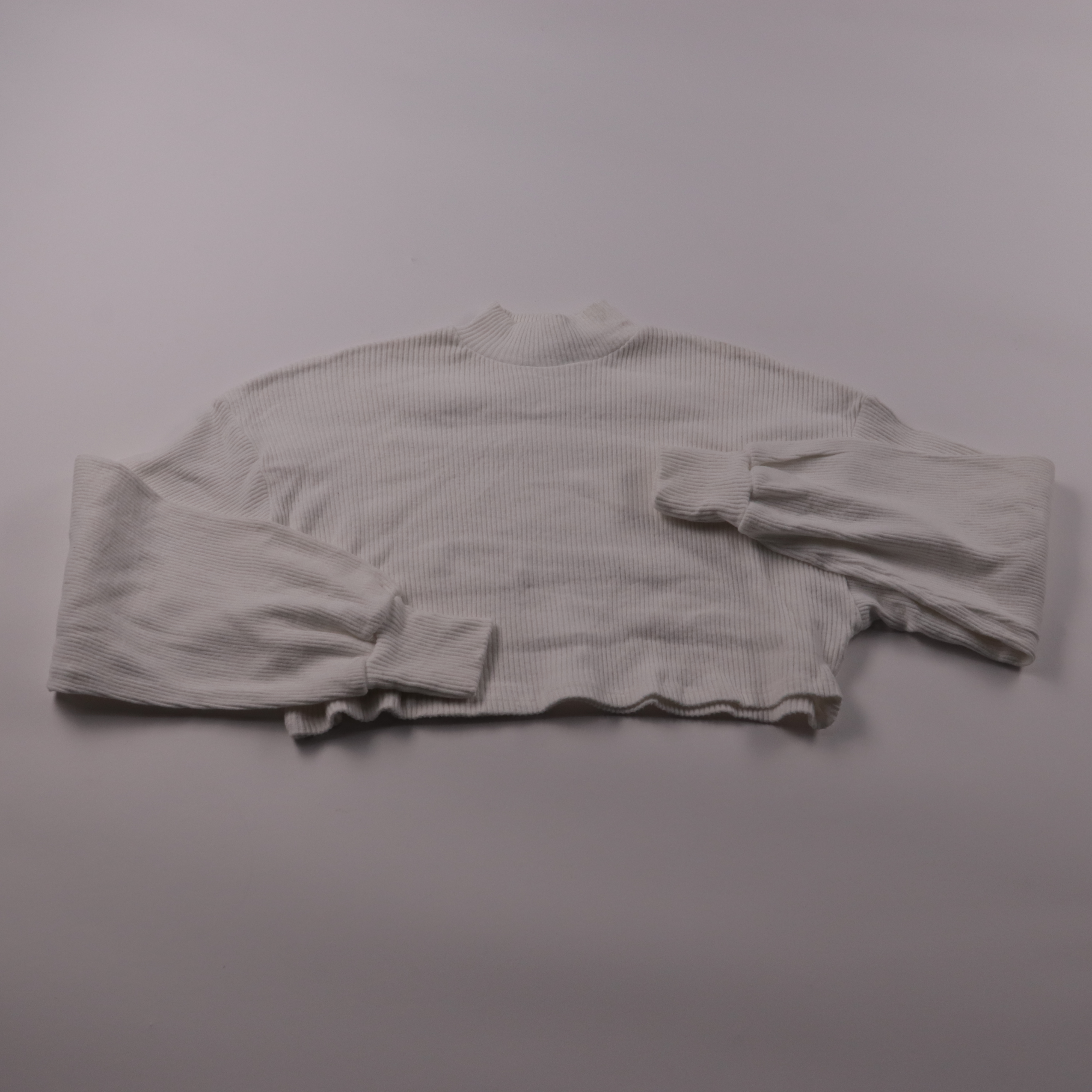 Белый укороченный лонгслив Bershka из фактурного рубчика с высоким воротником и длинным рукавом. Подойдёт для повседневных образов в прохладную погоду, хорошо сочетается с джинсами и юбками с высокой талией. Материал тянется и комфортно садится по фигуре.