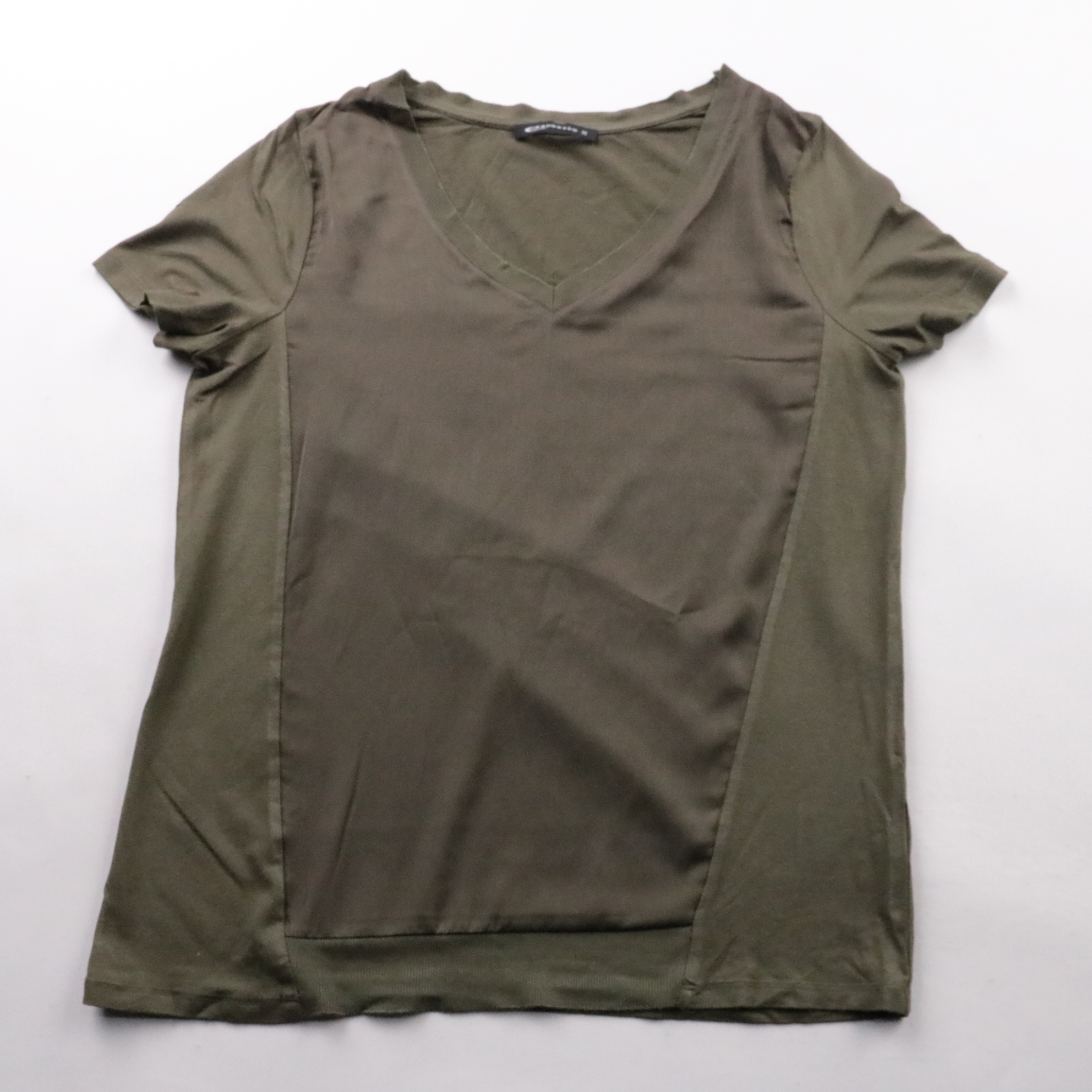 Футболка Expresso оливкового цвета с V-образным вырезом и коротким рукавом. Подойдёт для повседневных образов и офиса под жакет или кардиган. Практичный плюс — гладкая ткань почти не мнётся и легко сочетается с базовым гардеробом.