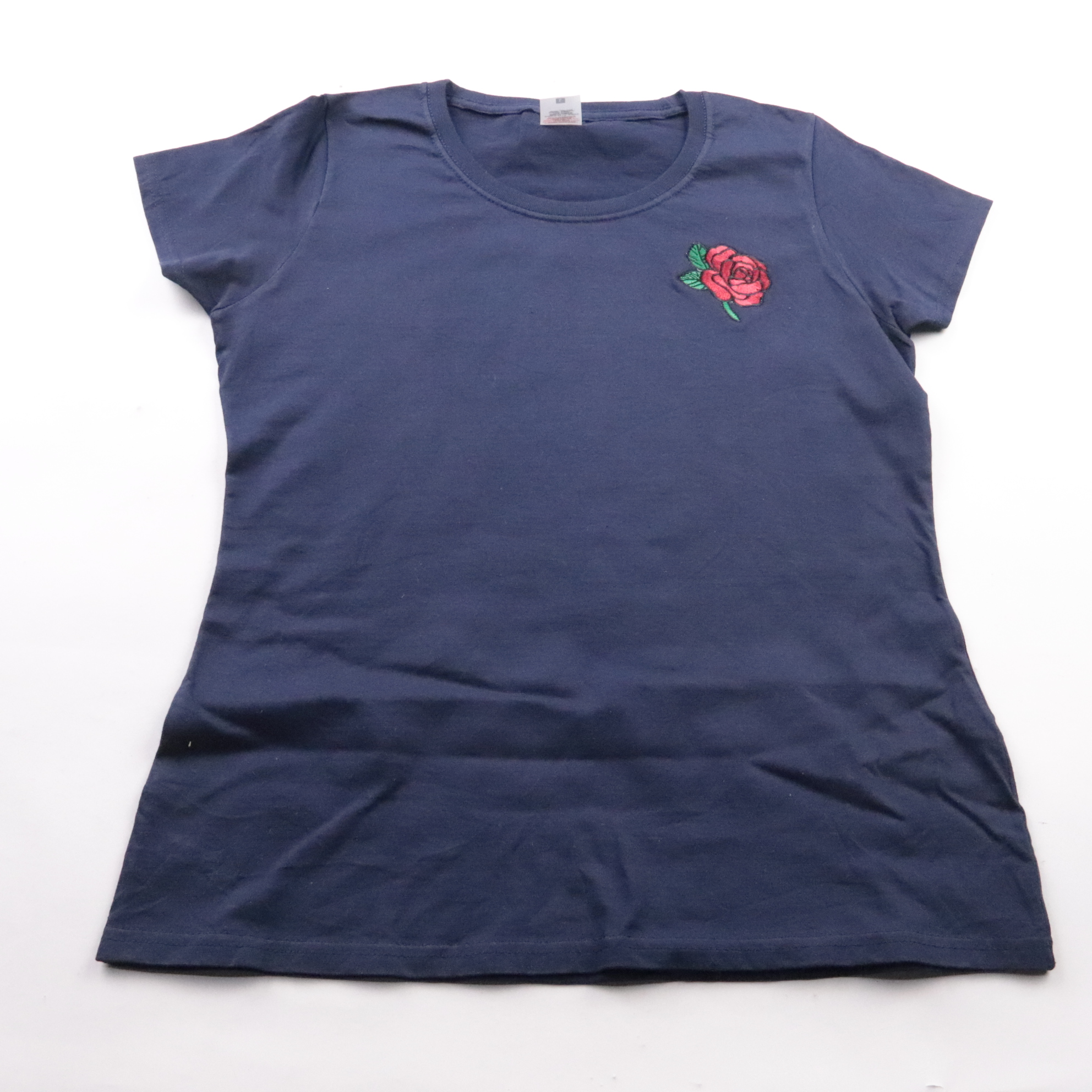 Женская хлопковая футболка тёмно-синего цвета с небольшой вышивкой розы на груди. Подойдёт для повседневной носки и базовых образов, хорошо сочетается с джинсами и юбками. Натуральный хлопок приятен к телу и хорошо пропускает воздух.