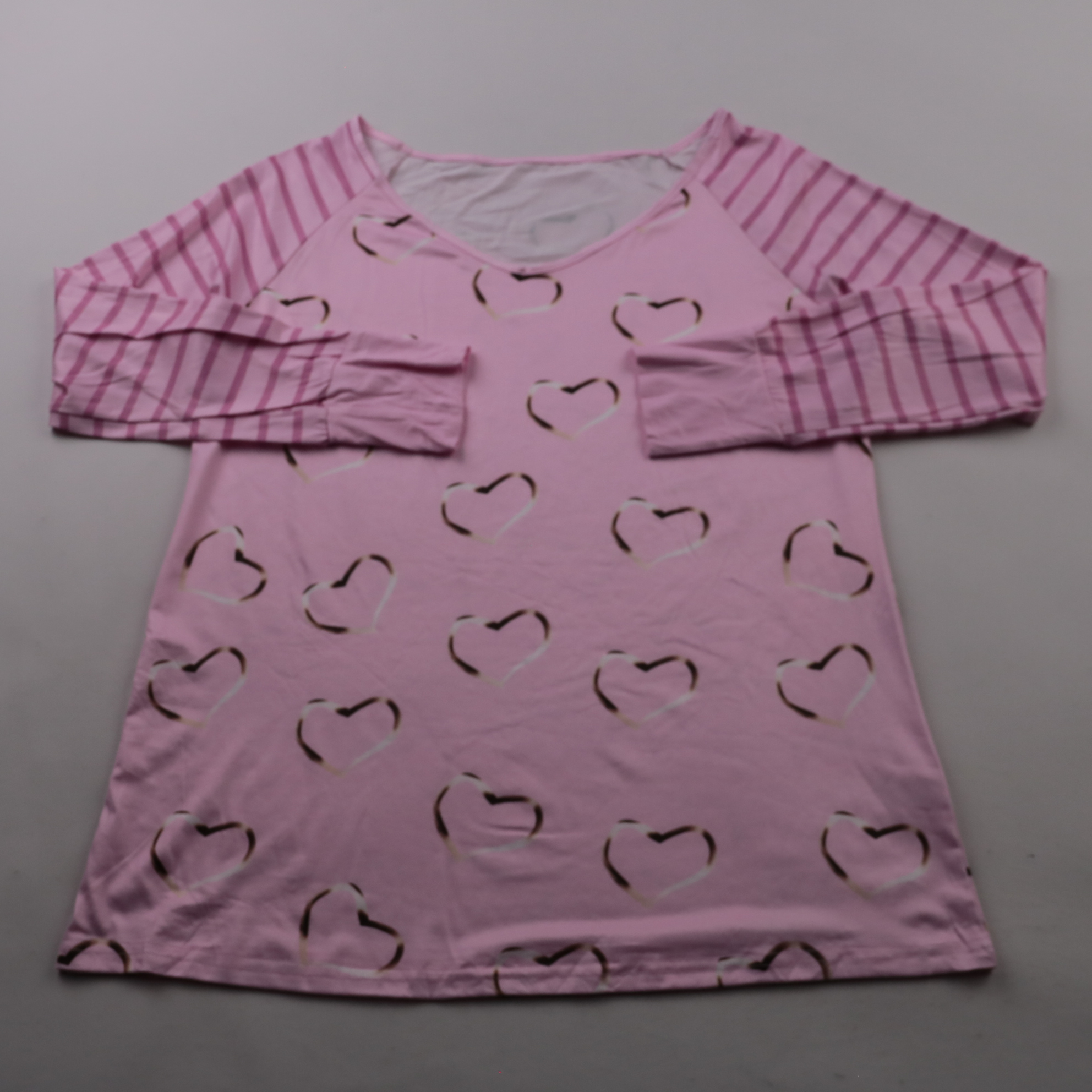 Розовый лонгслив с принтом сердечек и полосатыми рукавами реглан. Подойдёт для дома, сна и повседневных расслабленных образов в любое время года. Ткань тянется и почти не мнётся, поэтому удобно носить и брать с собой.