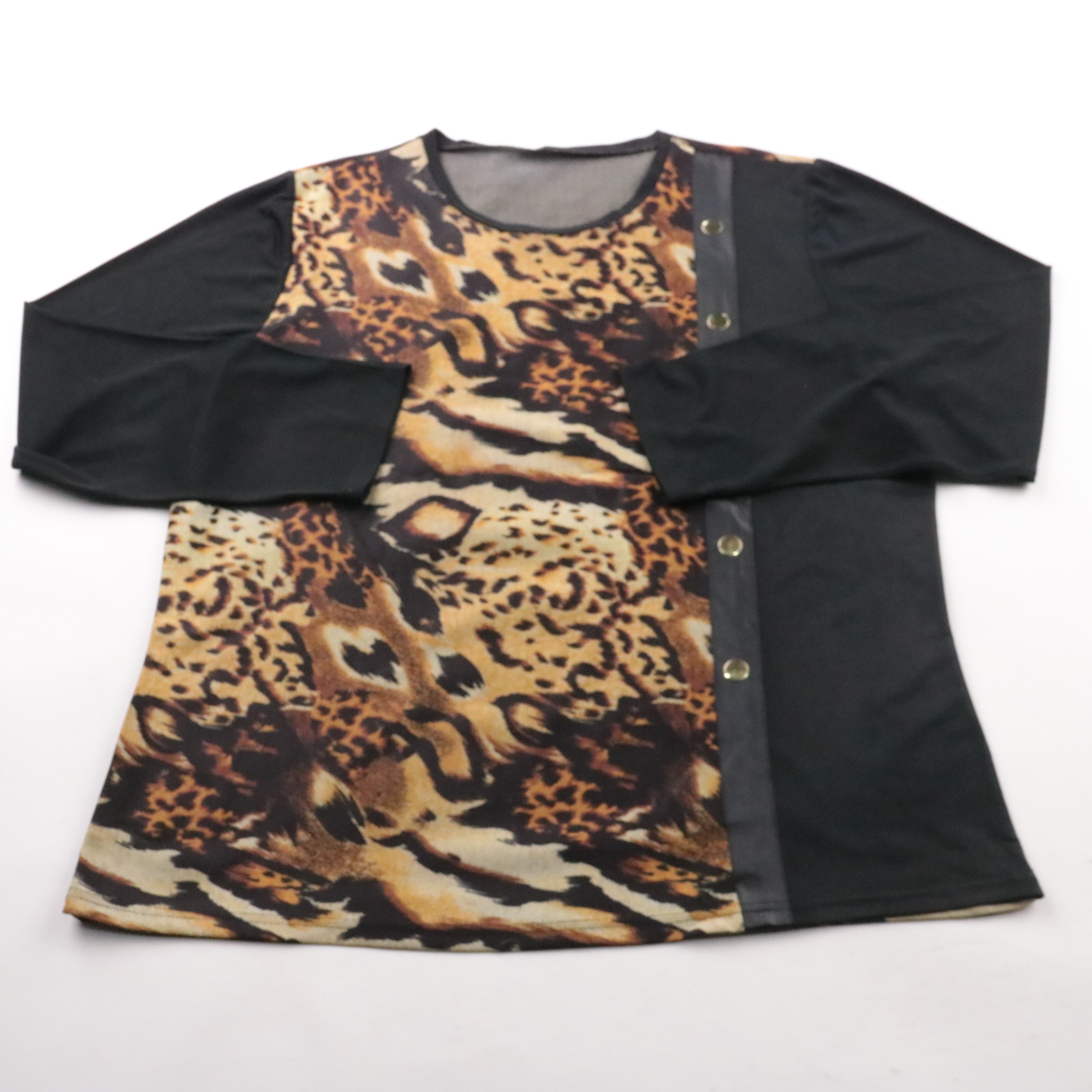 Женская футболка с анималистичным принтом (леопард) и черными рукавами, с декоративной планкой на кнопках. Подойдет для повседневных образов и встреч, хорошо сочетается с однотонными джинсами или юбкой. Практичный трикотаж комфортно носить и легко комб...