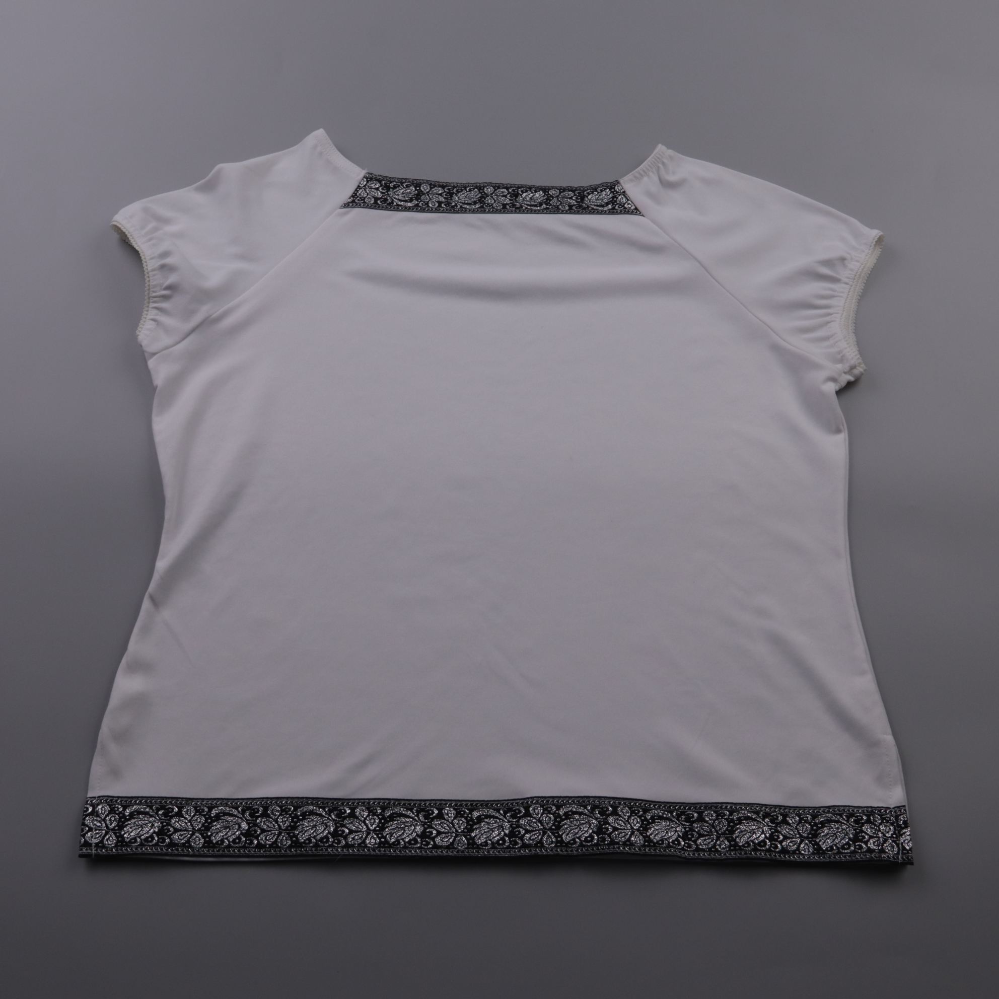 Женская белая футболка с коротким рукавом и декоративной чёрной жаккардовой тесьмой по горловине и по низу. Подойдёт для повседневных образов и офиса в сочетании с брюками или юбкой. Лёгкая ткань комфортна в носке и легко сочетается с базовыми вещами.
