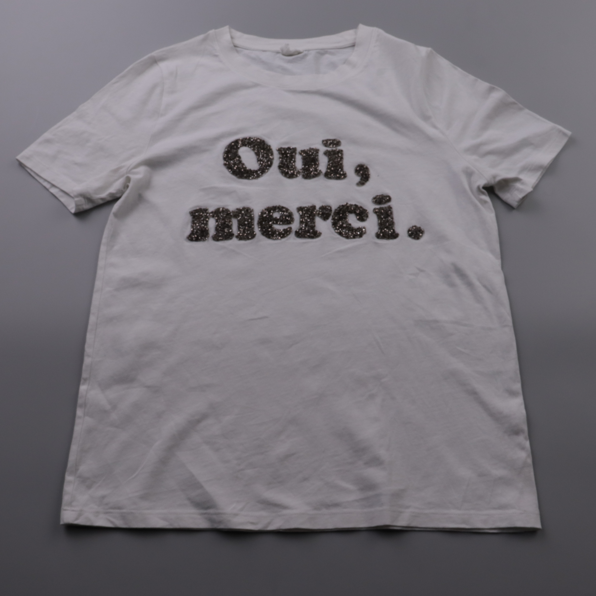 Женская белая футболка с круглым вырезом и декоративной надписью «Oui, merci.» из блестящих элементов. Подойдёт для повседневных образов с джинсами или юбкой в тёплое время года и как базовый слой под жакет. Лёгкий хлопковый трикотаж комфортно носится ...