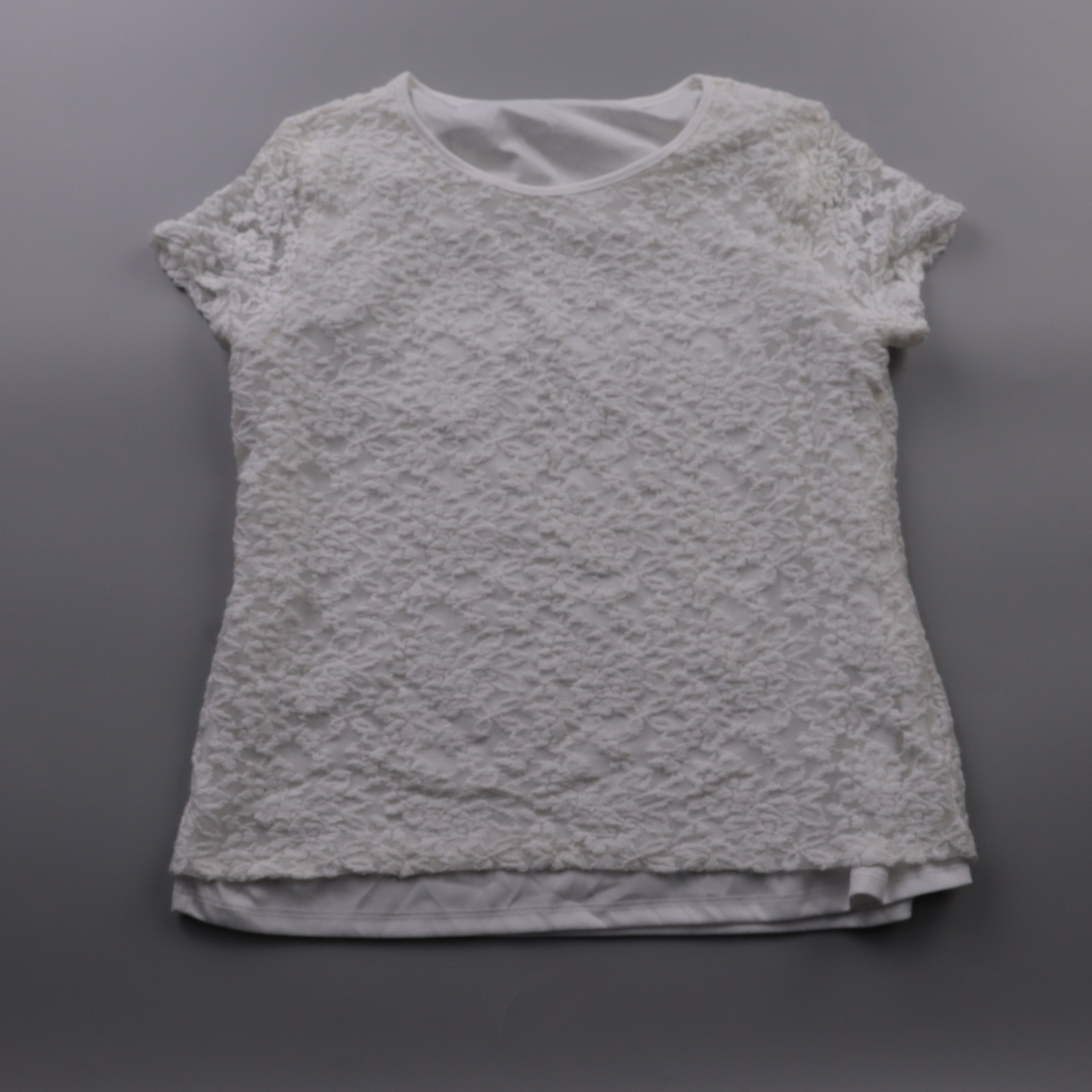 Женская белая футболка с фактурной кружевной/объёмной отделкой по всей поверхности и коротким рукавом. Подойдёт для повседневных и более нарядных образов с юбкой или брюками. Практична тем, что выглядит эффектно без дополнительного декора.