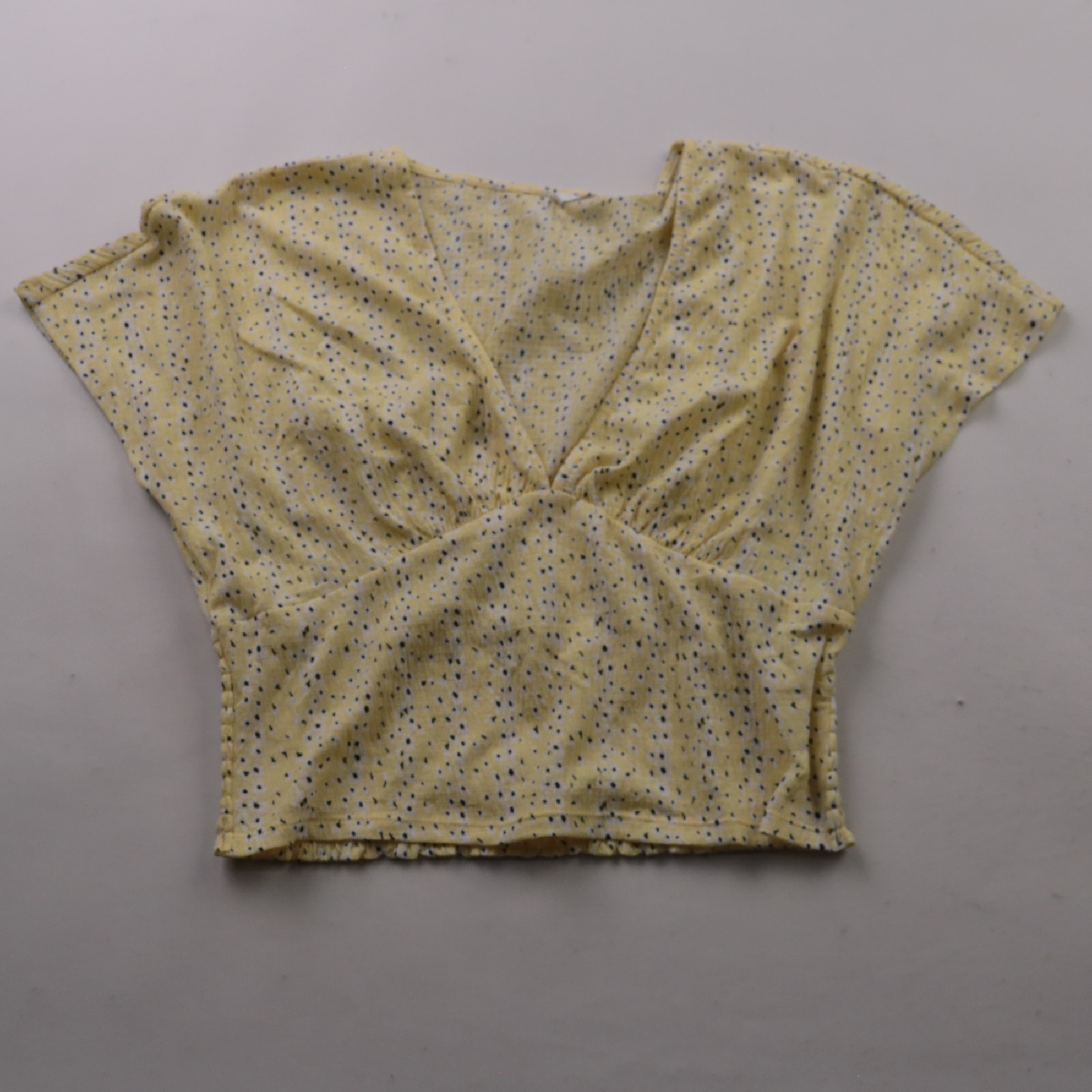 Женский топ Only жёлтого цвета с мелким принтом и V-образным вырезом, укороченный силуэт. Подойдёт для летних прогулок и повседневных образов с джинсами или юбкой. Лёгкий материал приятен к телу и быстро сохнет после стирки.