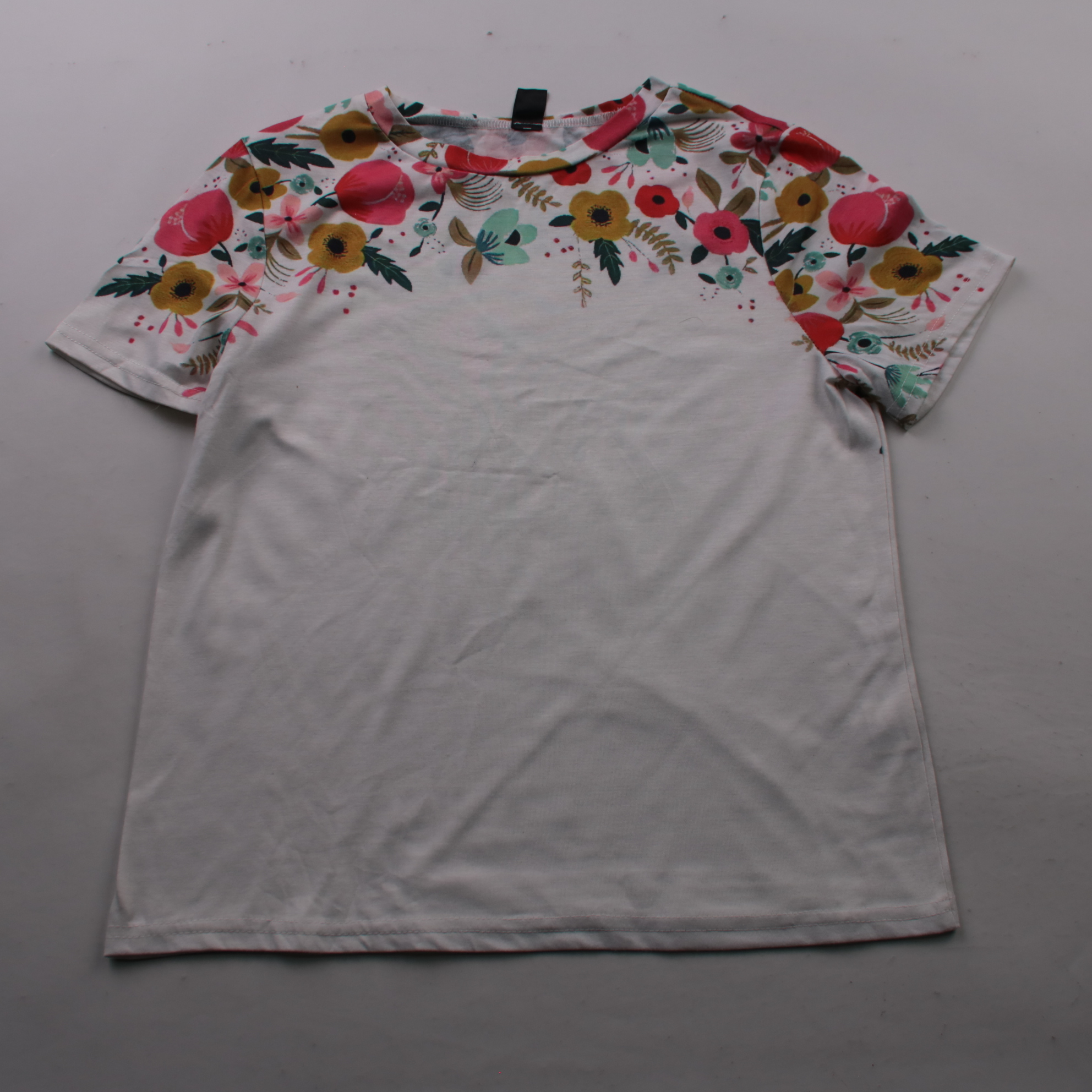 Футболка Shein белого цвета с цветочным принтом по верху и на рукавах. Подойдёт для летних повседневных образов с джинсами или шортами. Лёгкий полиэстер быстро сохнет и почти не мнётся.
