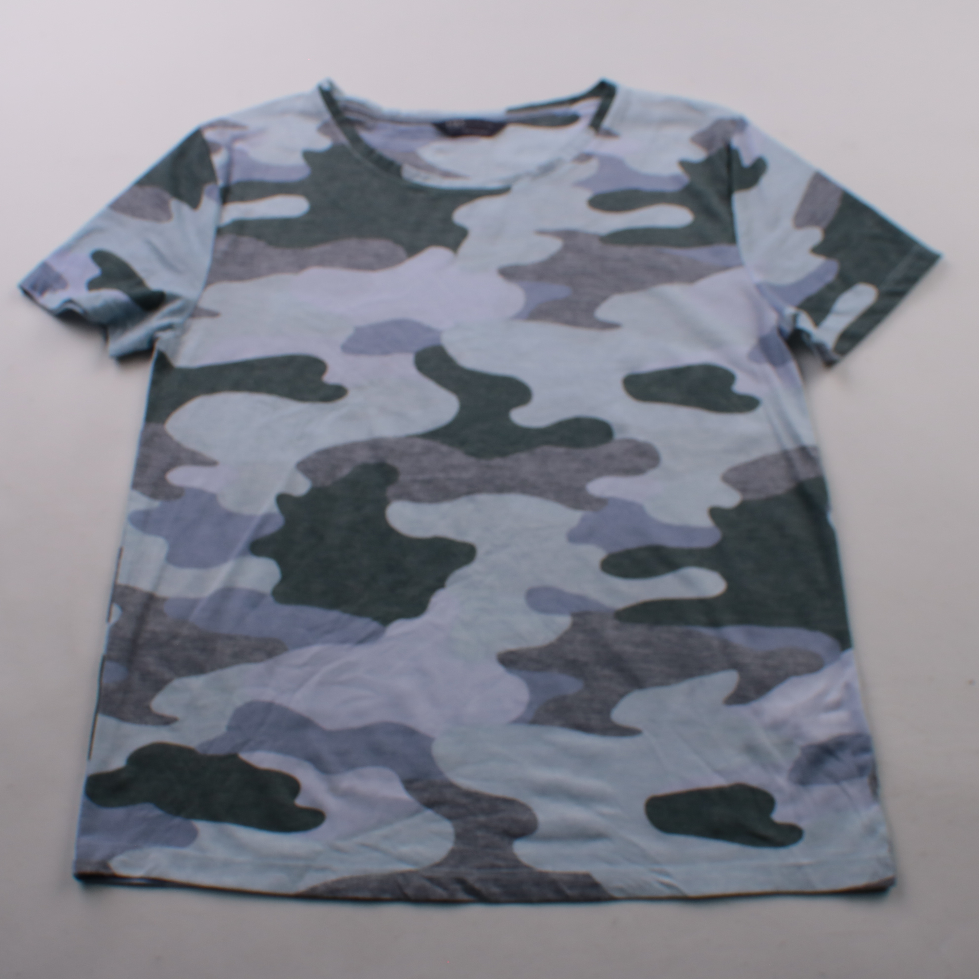 Футболка M&S Collection с коротким рукавом и камуфляжным принтом в серо-голубой гамме. Подойдёт для повседневных образов и отдыха, хорошо сочетается с джинсами и спортивными брюками. Материал лёгкий и быстро сохнет, удобно в уходе.