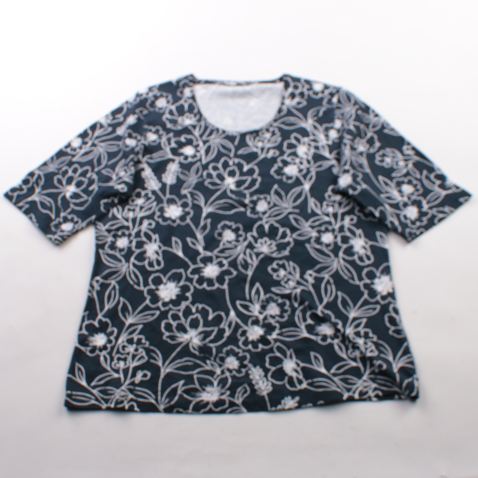 Женская футболка с цветочным принтом на тёмно-синем фоне и округлым вырезом, рукава короткие. Подойдёт для повседневных образов летом и в тёплое межсезонье, хорошо сочетается с джинсами и однотонными юбками. Практичный плюс — рисунок немаркий и визуаль...