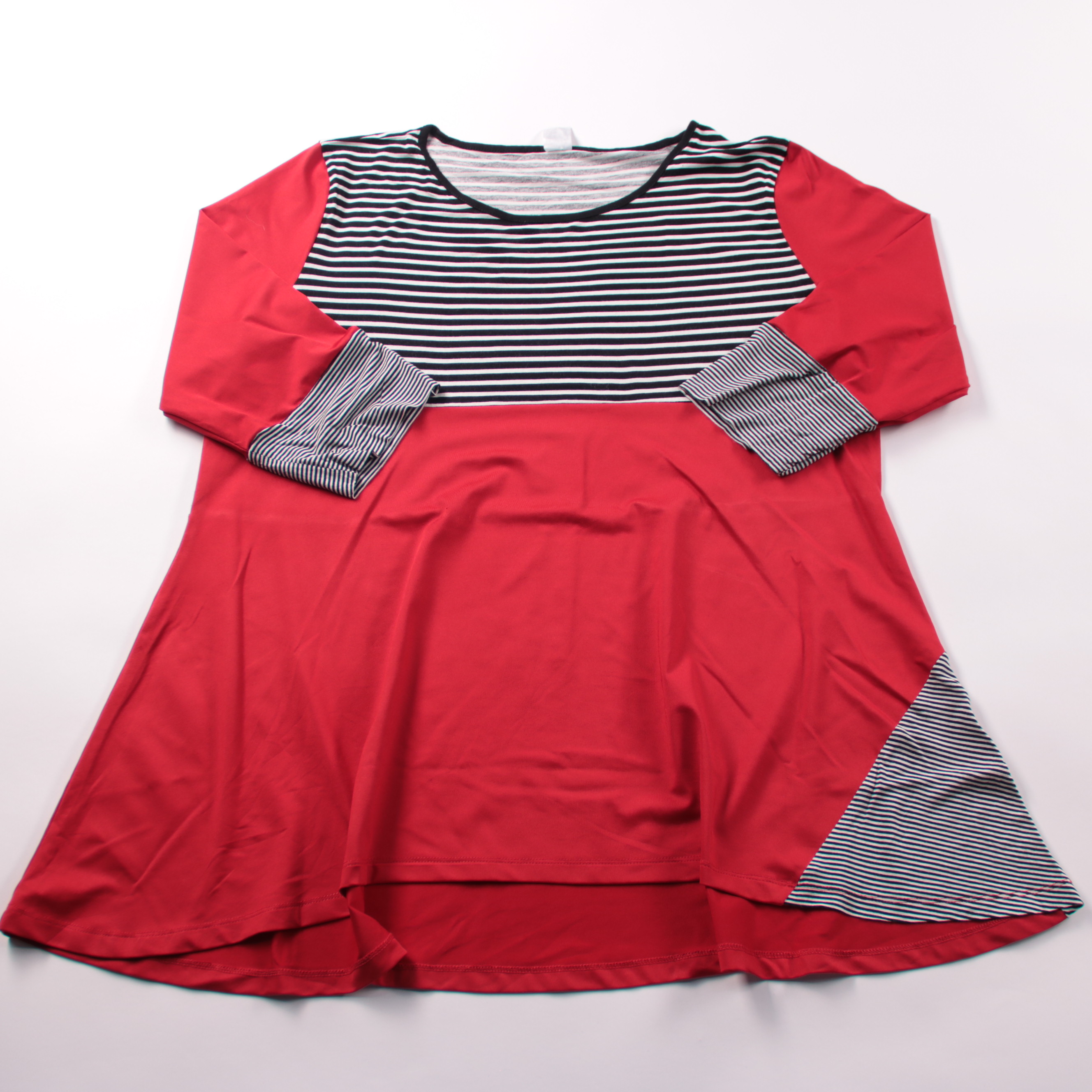 Женский лонгслив в красном цвете с контрастными полосатыми вставками и манжетами. Подойдёт для повседневных образов в демисезон и прохладным летом, хорошо сочетается с джинсами и легинсами. Свободный крой не сковывает движения и комфортен на каждый день.