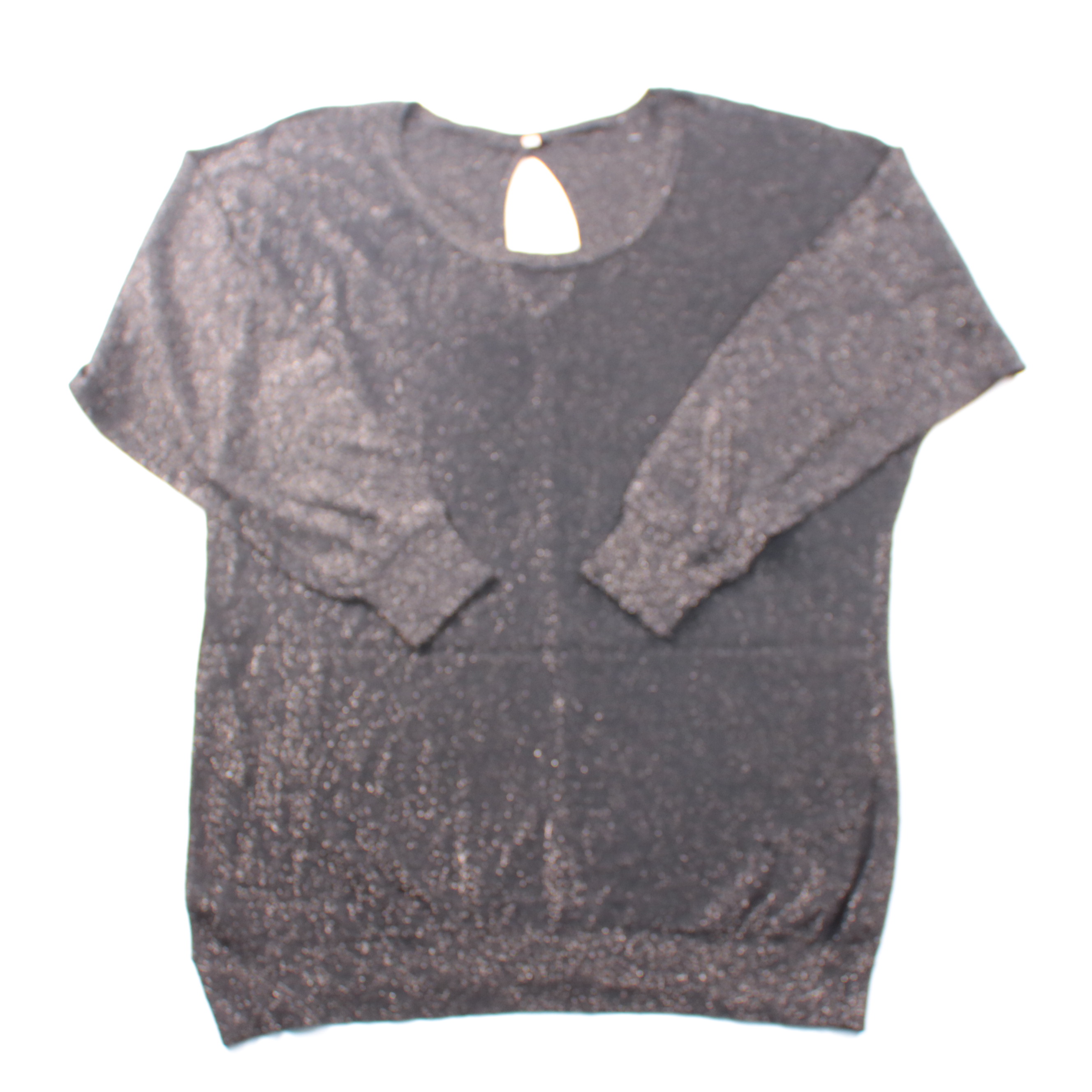 Женский лонгслив с люрексом и вырезом-каплей сзади, без указания бренда. Подойдёт для вечерних выходов и на каждый день с джинсами или юбкой. Трикотаж тянется и комфортно садится по фигуре.