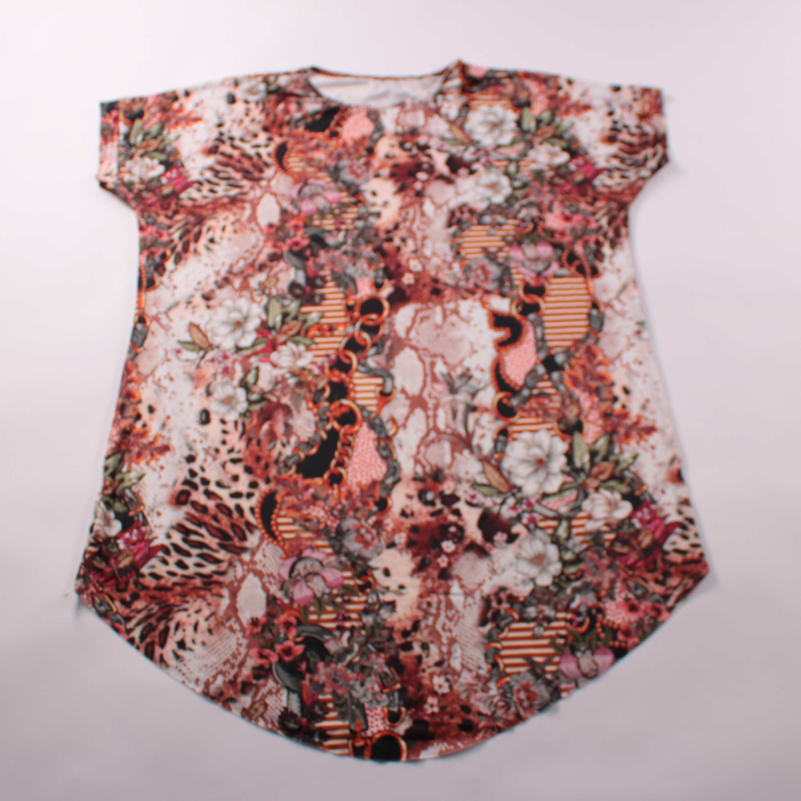 Женская футболка с ярким принтом в стиле пэчворк: цветы, цепи и анималистичные элементы. Подойдёт для повседневных образов летом или в тёплом помещении, хорошо сочетается с джинсами и однотонными брюками. Лёгкий синтетический трикотаж почти не мнётся и...