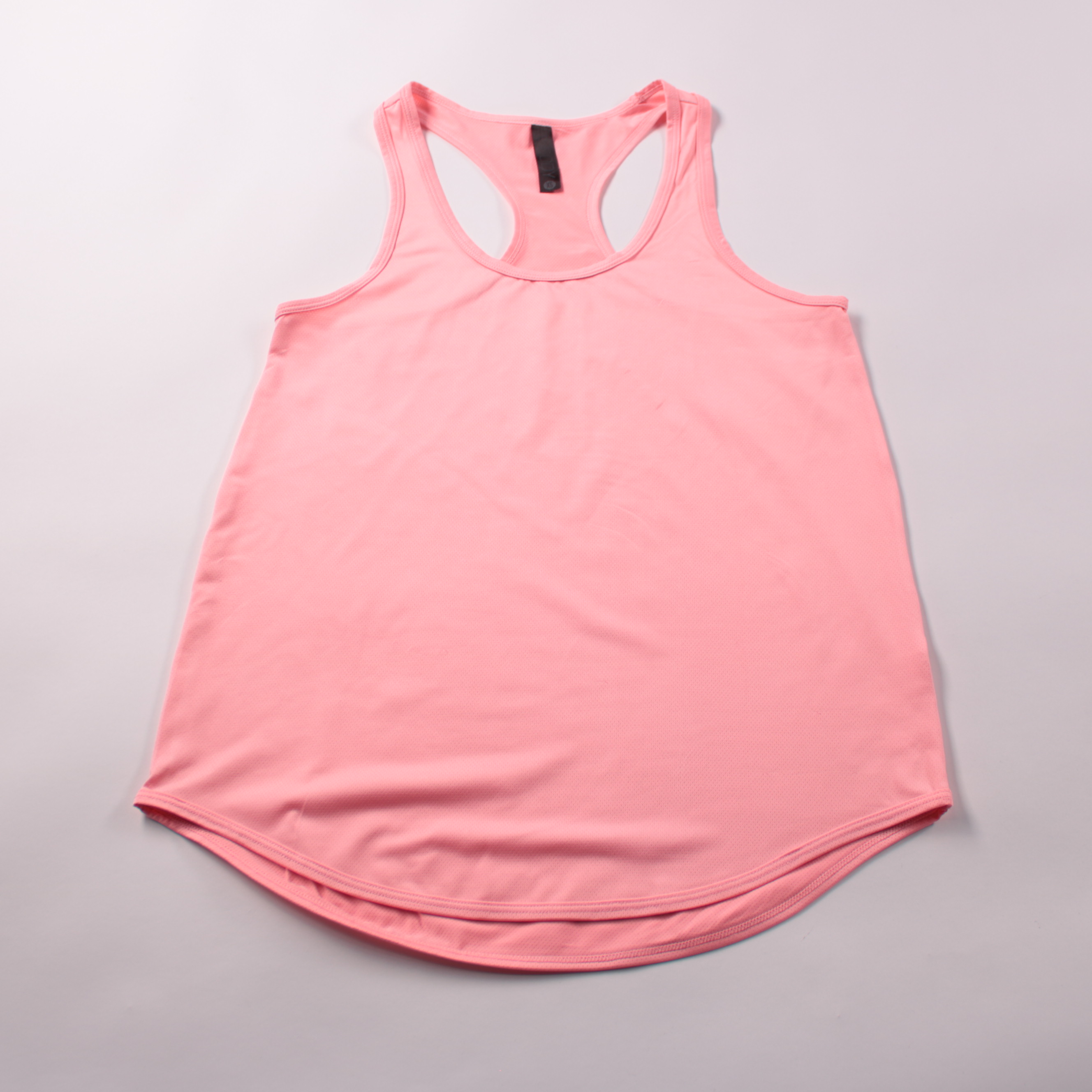 Спортивная майка OYSHO розового цвета с вырезом-борцовкой и удлинённой спинкой. Подойдёт для тренировок, бега и активных прогулок в тёплую погоду. Лёгкая синтетическая ткань быстро сохнет и хорошо отводит влагу.