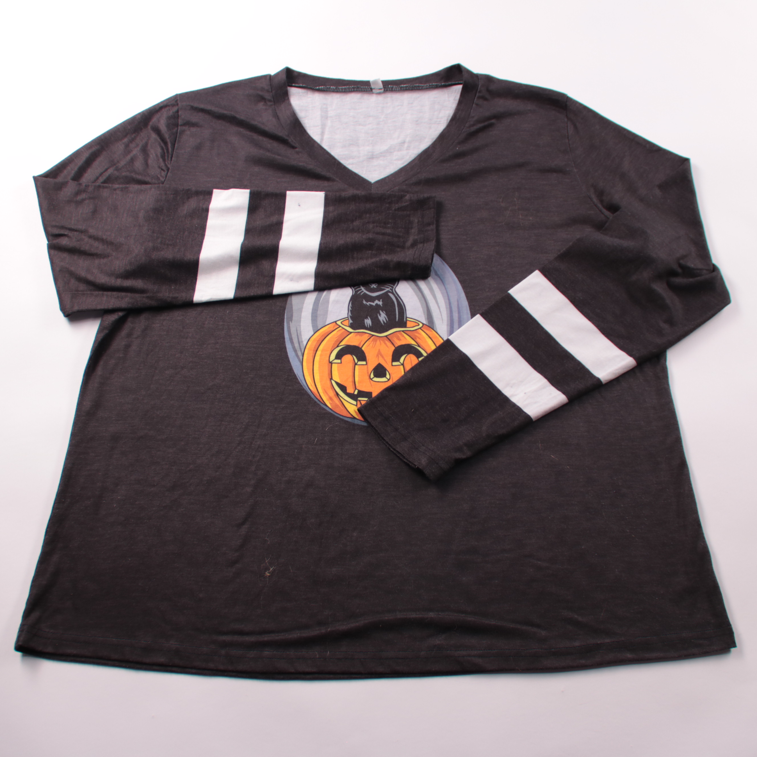 Женский лонгслив с V-образным вырезом и принтом тыквы (Halloween), рукава с белыми полосками. Подойдёт для повседневной носки и тематических образов на осень. Лёгкий материал и длинный рукав делают вещь удобной для прохладной погоды.