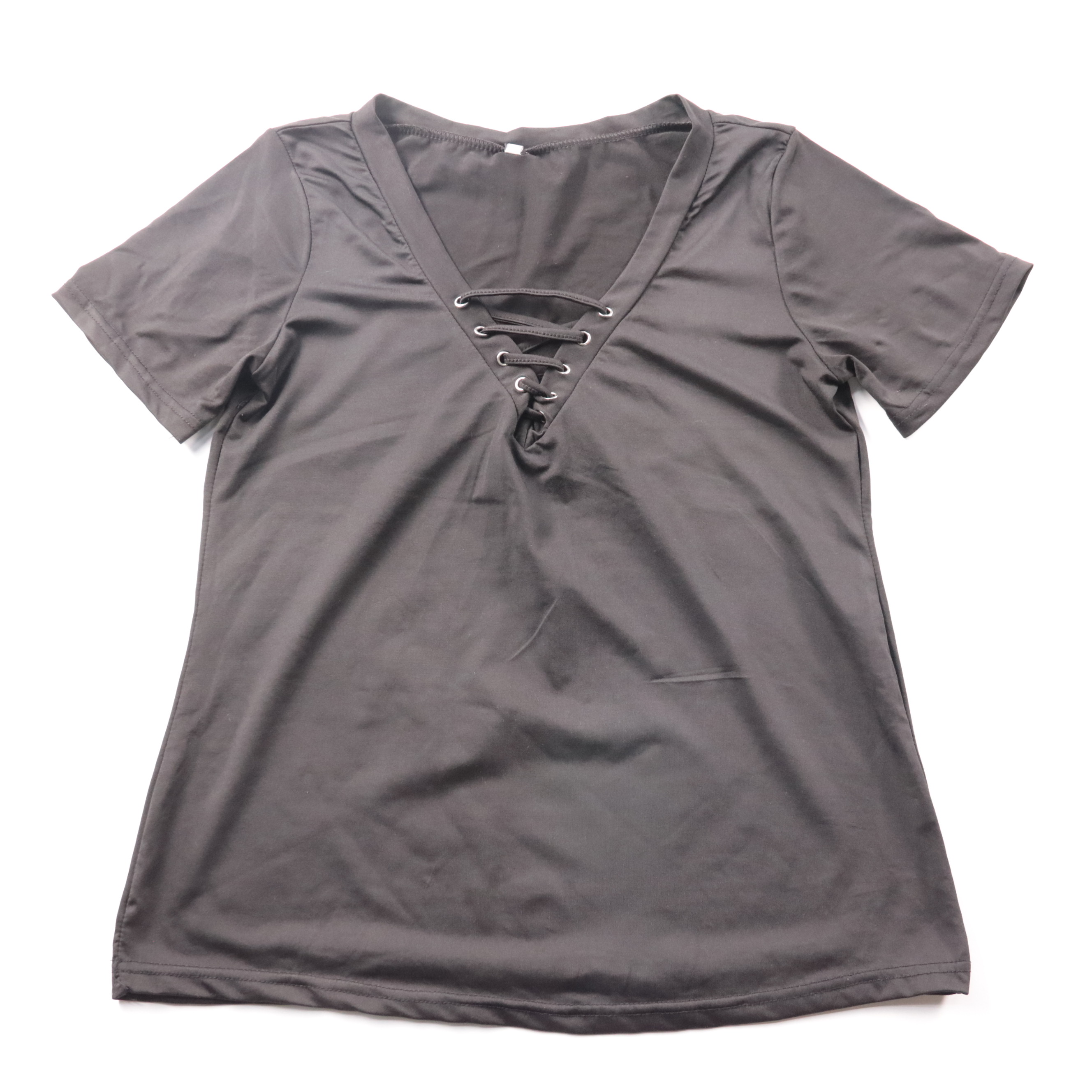 Чёрная футболка со шнуровкой на V-образном вырезе, материал 100% полиэстер. Подойдёт для повседневных образов и вечерних выходов, хорошо сочетается с джинсами и юбками. Полиэстер быстро сохнет и почти не мнётся, удобен в уходе.