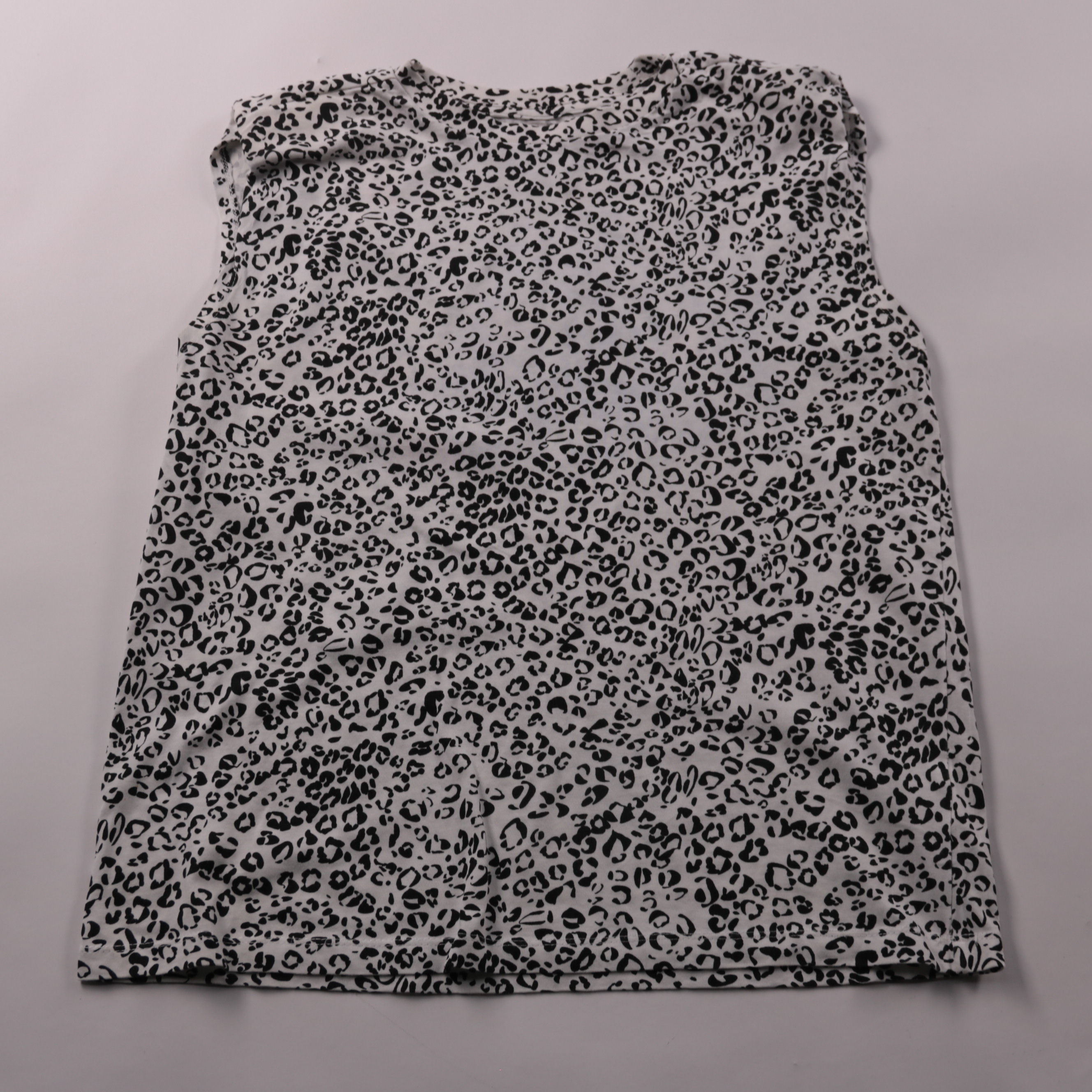 Топ F&F без рукавов с чёрным леопардовым принтом на светлом фоне. Подойдёт для лета и тёплой погоды, легко сочетается с джинсами или юбкой. Практичен тем, что тонкий материал быстро сохнет и удобно носится в повседневных образах.