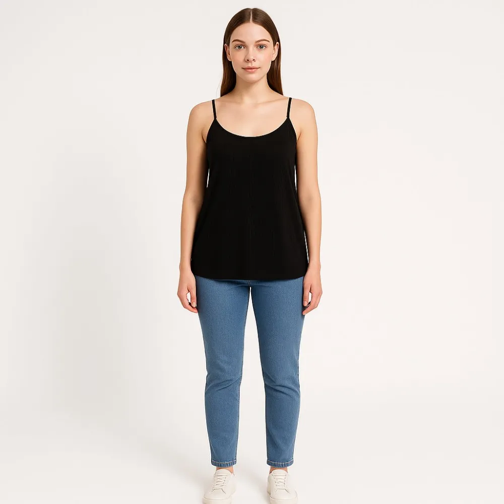 Женская майка VILA на тонких бретелях, чёрного цвета. Подойдёт для повседневных образов и как базовый слой под жакет или кардиган. Лёгкая ткань (полиэстер с вискозой) почти не мнётся и проста в уходе.