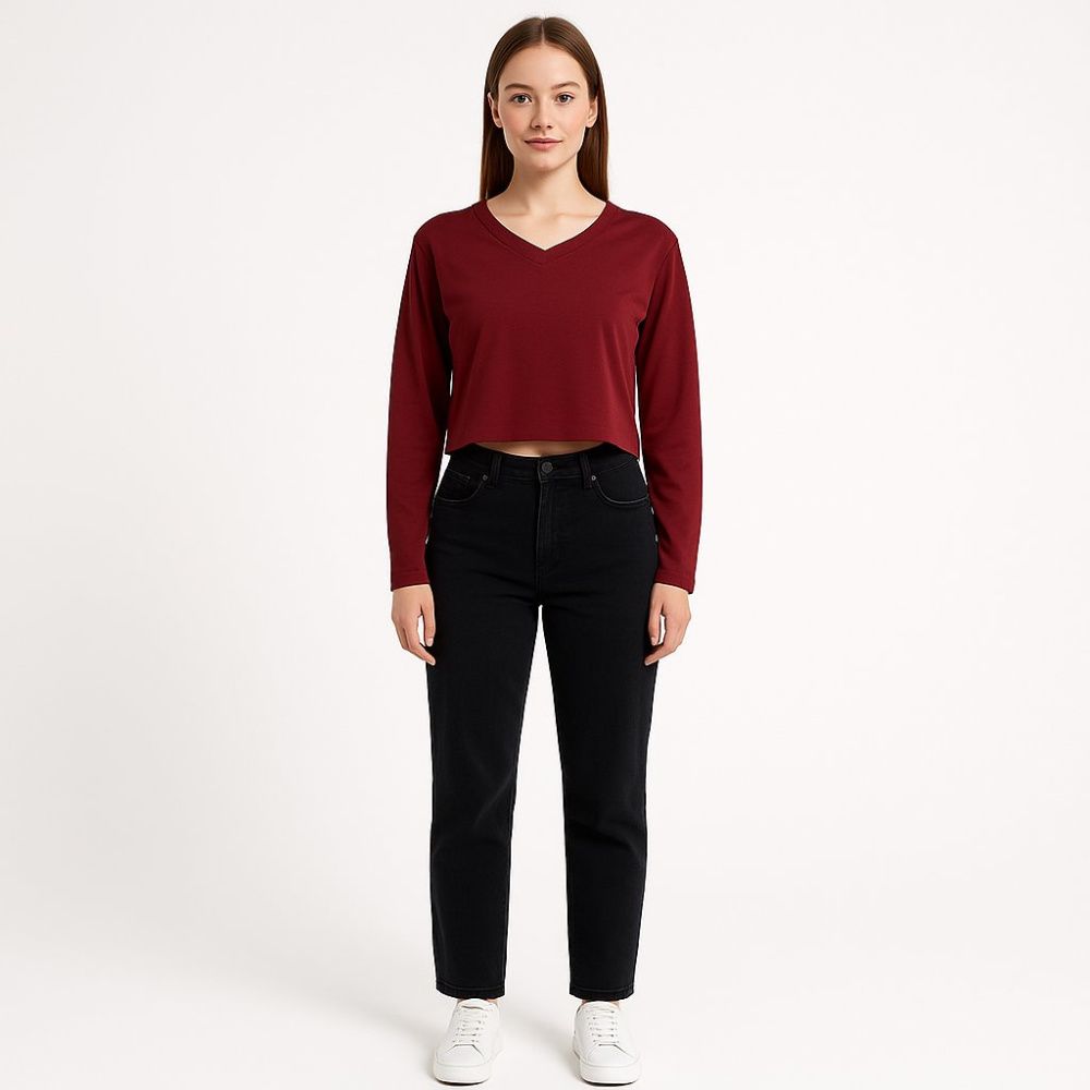 Женский лонгслив укороченного кроя с V‑образным вырезом в бордовом цвете. Подойдёт для повседневных образов с джинсами или юбкой в межсезонье и круглый год в помещении. Тонкий трикотаж приятен к телу и удобно носится как самостоятельный верх или под жа...