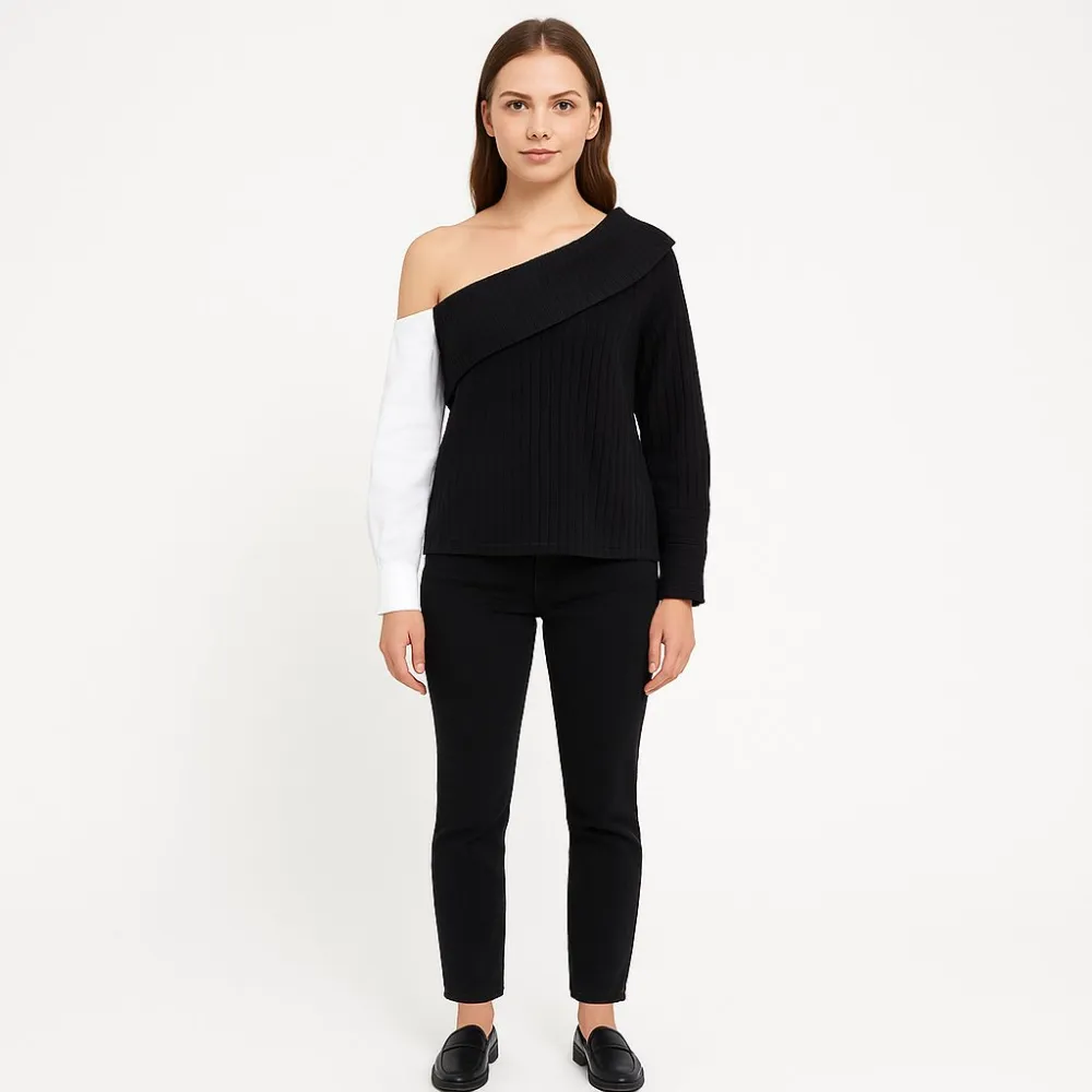 Лонгслив Shein в рубчик с асимметричным вырезом на одно плечо и контрастным белым рукавом. Подойдёт для повседневных образов и выхода в город, хорошо сочетается с джинсами и брюками. Эластичная ткань тянется и комфортно садится по фигуре.