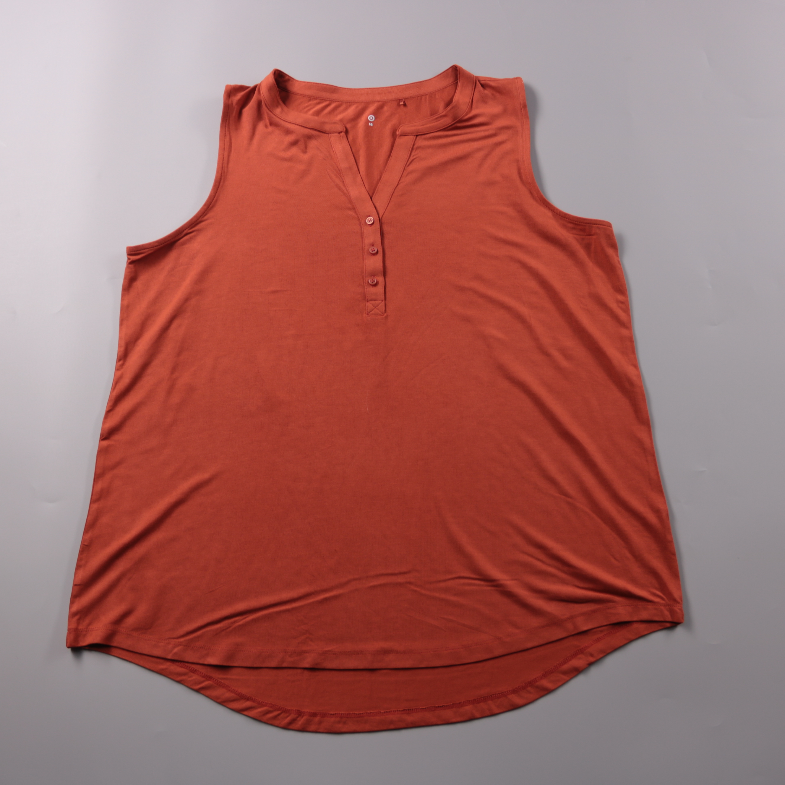 Женская майка Woman терракотового цвета, без рукавов, с планкой на пуговицах и небольшим вырезом. Подойдёт для тёплой погоды и многослойных образов под жакет или кардиган. Практична тем, что ткань мягкая и слегка тянется, поэтому комфортна в носке.