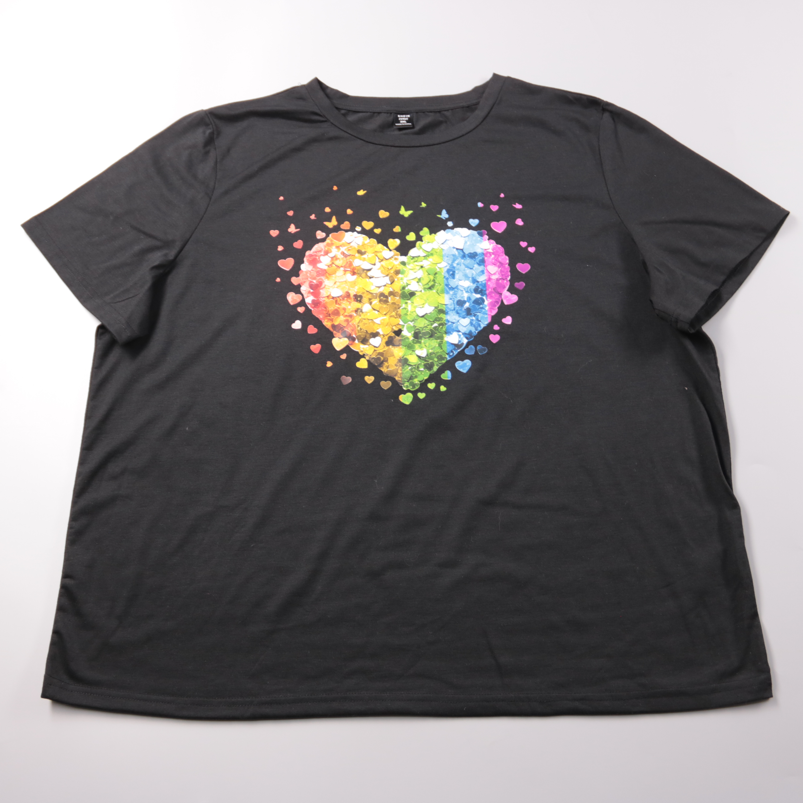 Женская футболка Shein Curve чёрного цвета с ярким принтом в виде радужного сердца. Подойдёт для повседневных образов и прогулок, хорошо сочетается с джинсами и шортами. Материал тянется и комфортно сидит за счёт добавления эластана.