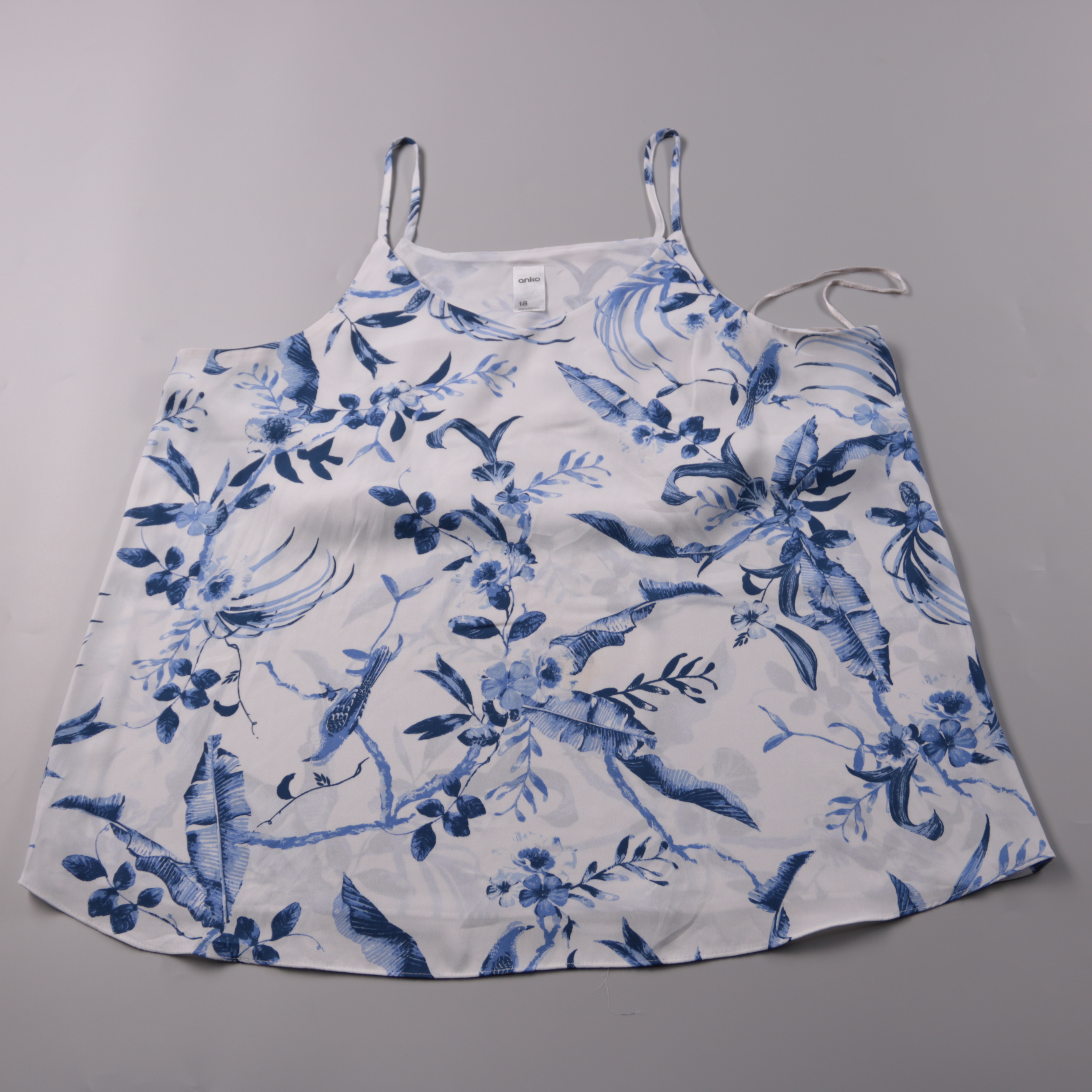 Лёгкий женский топ Anko на тонких бретелях с бело-синим цветочным принтом. Подойдёт для лета, отпуска и повседневных образов с шортами или юбкой. Полиэстер быстро сохнет и почти не мнётся, удобно брать в поездки.