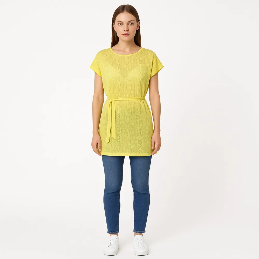 Женская туника Anamor из 100% полиэстера, лёгкая и приятная к телу, с фактурной тканью и поясом на талии. Подойдёт для лета и тёплой погоды, можно носить с джинсами или леггинсами. Полиэстер почти не мнётся и быстро сохнет.