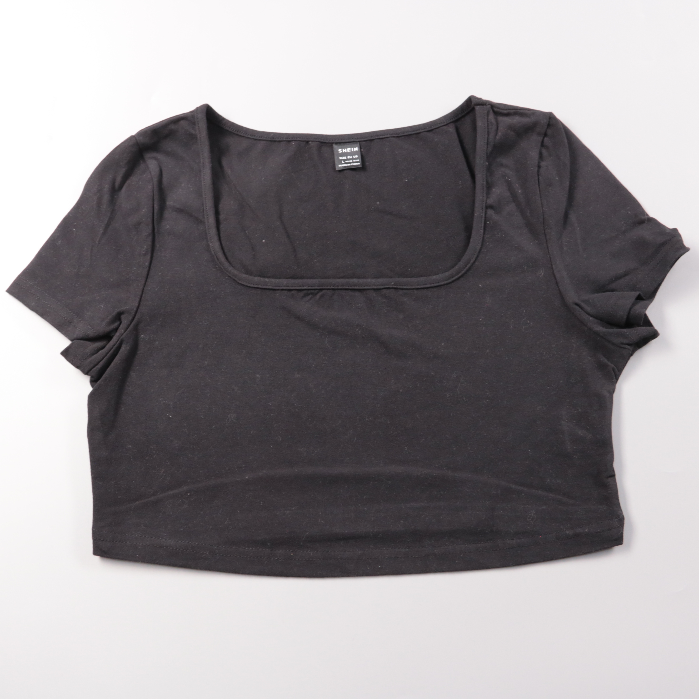 Черный укороченный топ Shein с квадратным вырезом и коротким рукавом. Подойдет для повседневных образов и на выход, хорошо смотрится с джинсами или юбкой. Тянущаяся хлопковая ткань комфортно садится по фигуре и не сковывает движения.
