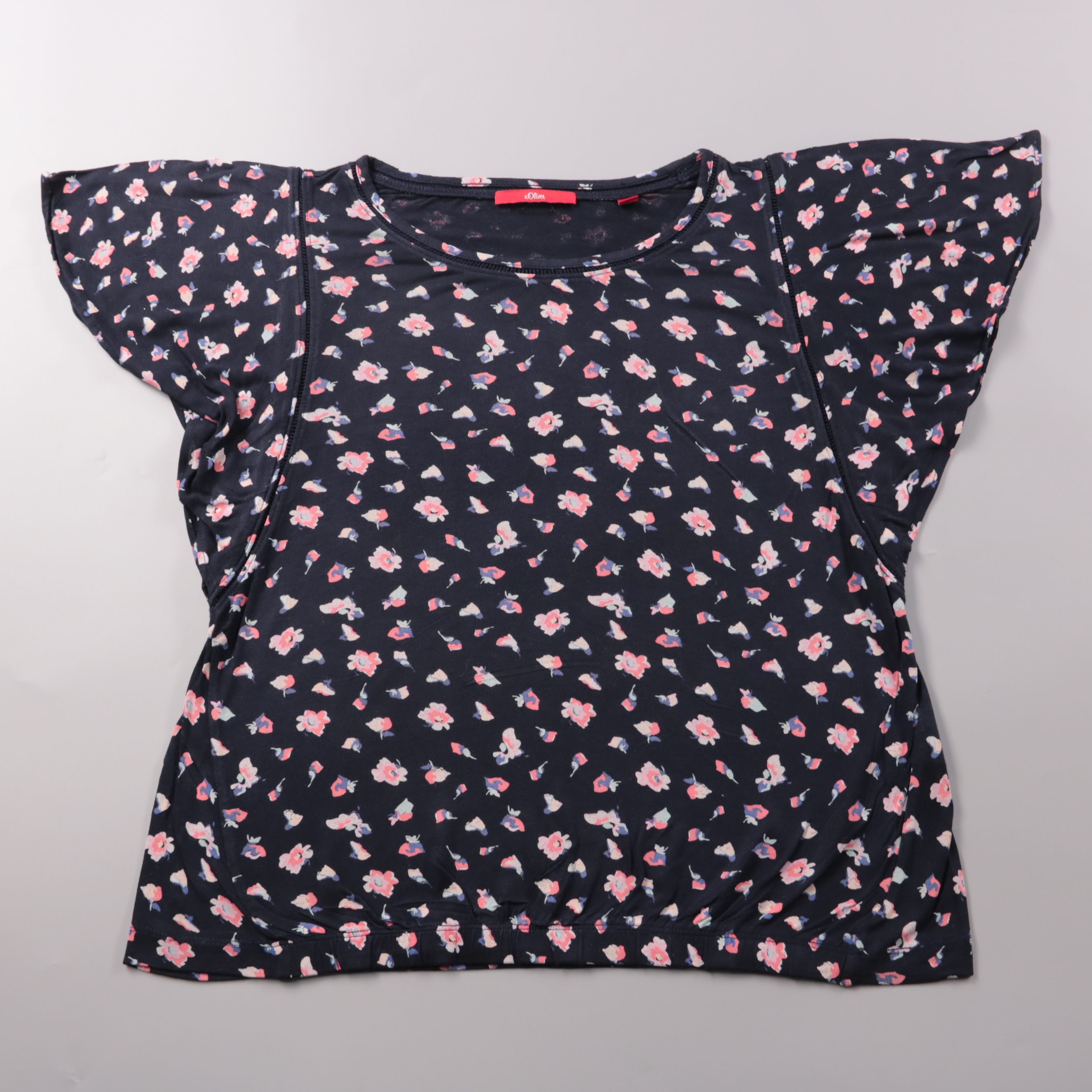 Женская футболка S.Oliver тёмно-синего цвета с мелким цветочным принтом и рукавами-крылышками. Подойдёт для повседневных летних образов, хорошо сочетается с джинсами, шортами или юбкой. Лёгкая вискоза приятно ощущается на коже и хорошо дышит.