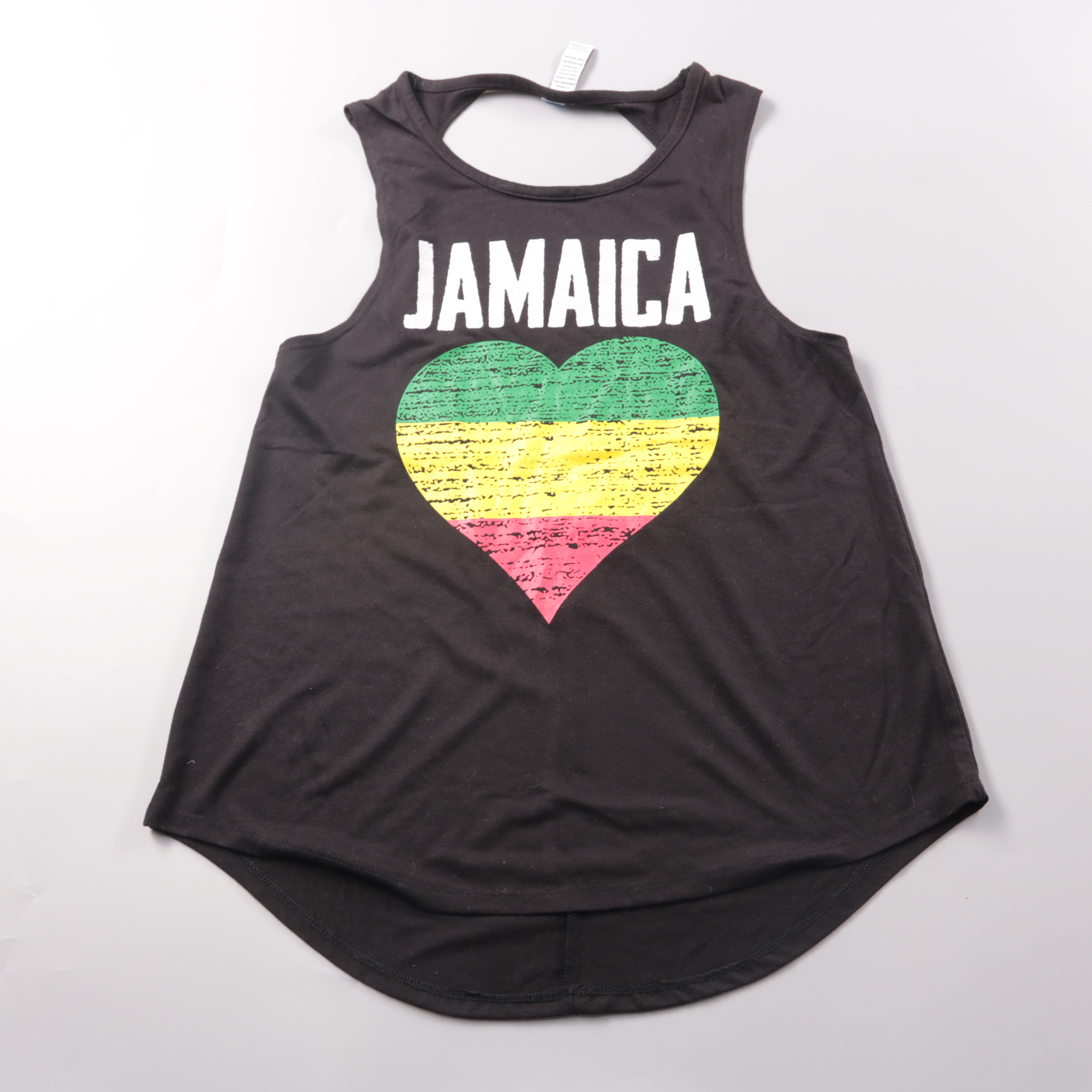 Женская майка SUN*KISSED чёрного цвета с принтом «JAMAICA» и сердцем в ярких полосах. Подойдёт для лета, отдыха и прогулок, хорошо смотрится с шортами или джинсами. Лёгкая ткань и свободный крой обеспечивают комфорт и не сковывают движения.