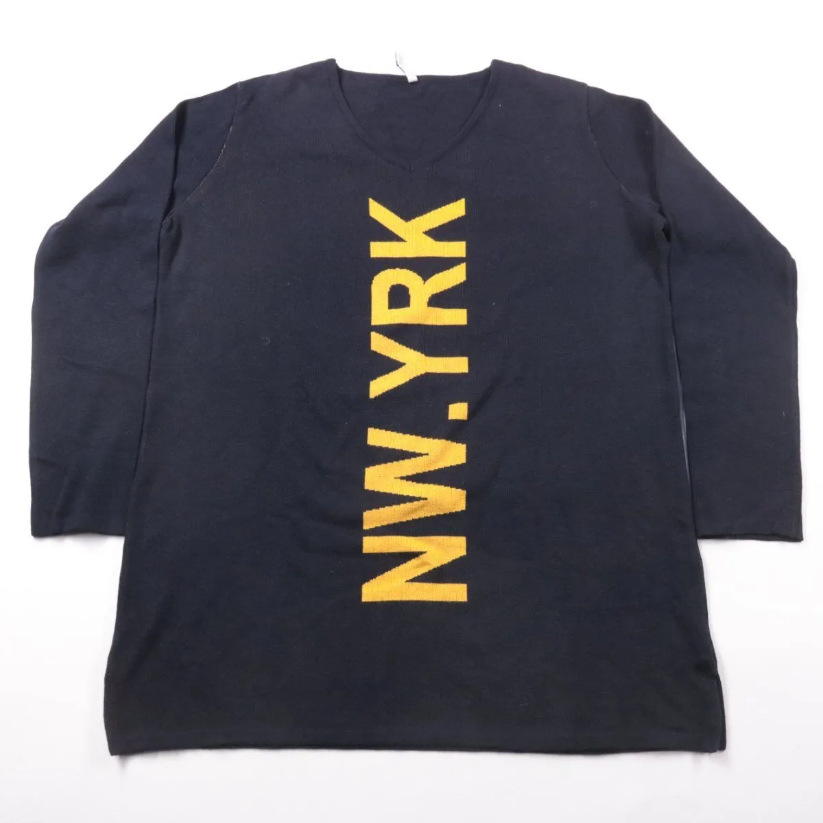 Женский лонгслив Zoso тёмно-синего цвета с V-образным вырезом и крупным контрастным принтом «N.W.YRK» спереди. Подойдёт для повседневных образов и в офис с джинсами или брюками. Ткань с эластаном хорошо тянется и комфортно садится по фигуре.