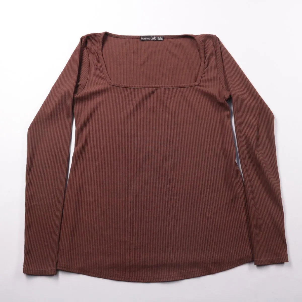 Женский лонгслив Boohoo из трикотажа в рубчик коричневого цвета, с квадратным вырезом. Подойдёт для повседневных образов и под жакет/кардиган в прохладную погоду. Материал тянется и комфортно садится по фигуре.