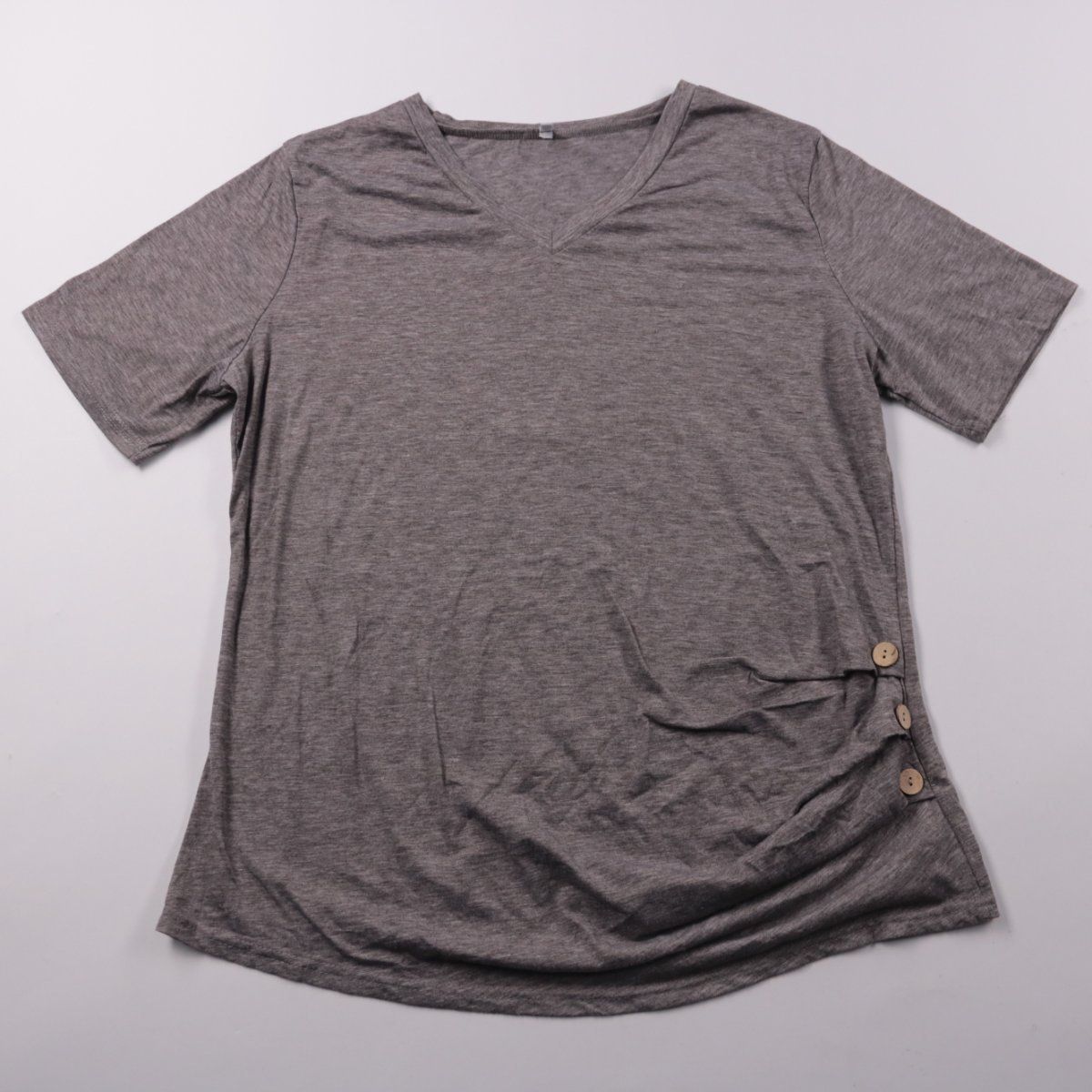 Женская серая футболка с V-образным вырезом и декоративной сборкой на боку с пуговицами. Подойдёт для повседневных образов и поездок, легко сочетается с джинсами и юбками. Ткань эластичная и почти не мнётся, удобно носить целый день.