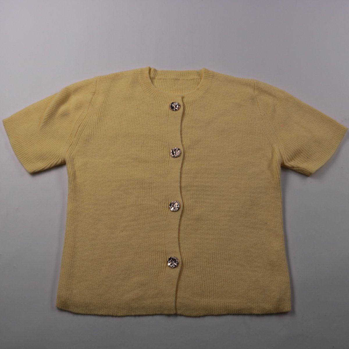 Женский трикотажный топ в рубчик с коротким рукавом и декоративными пуговицами спереди. Подойдёт для повседневных образов и в офис с жакетом или кардиганом. Смесовая пряжа хорошо держит форму и почти не мнётся.